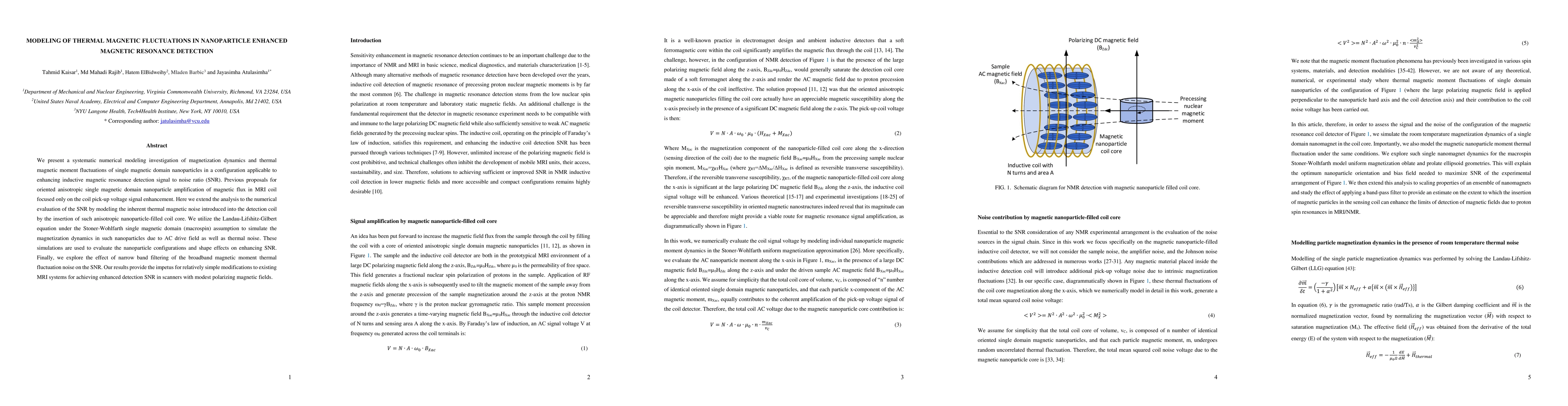 This paper models the magnetization dynamics and thermal magnetic noise of single magnetic domain nanoparticles in MRI coils to enhance signal-to-noise ratio (SNR). It evaluates nanoparticle configurations and shape effects on SNR, and explores the impact of narrow band filtering on thermal noise reduction.