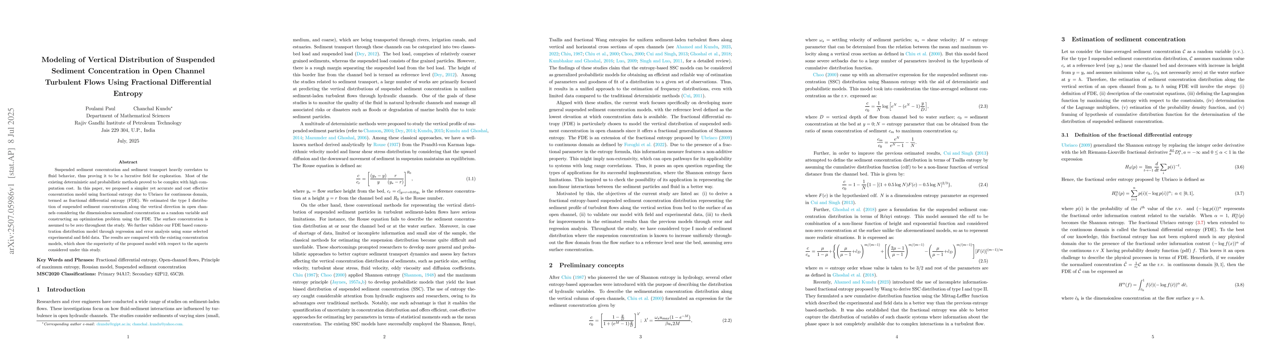 Suspended sediment concentration and sediment transport heavily correlates to fluid behavior, thus proving it to be a lucrative field for exploration. Most of the existing deterministic and probabilistic methods proved to be complex with high computation cost. In this paper, we proposed a simpler yet accurate and cost effective concentration model using fractional entropy due to Ubriaco for continuous domain, termed as fractional differential entropy (FDE). We estimated the type I distribution of suspended sediment concentration along the vertical direction in open channels considering the dimensionless normalized concentration as a random variable and constructing an optimization problem using the FDE. The surface concentration is assumed to be zero throughout the study. We further validate our FDE based concentration distribution model through regression and error analysis using some selected experimental and field data. The results are compared with the existing concentration models, which show the superiority of the proposed model with respect to the aspects considered under this study.
