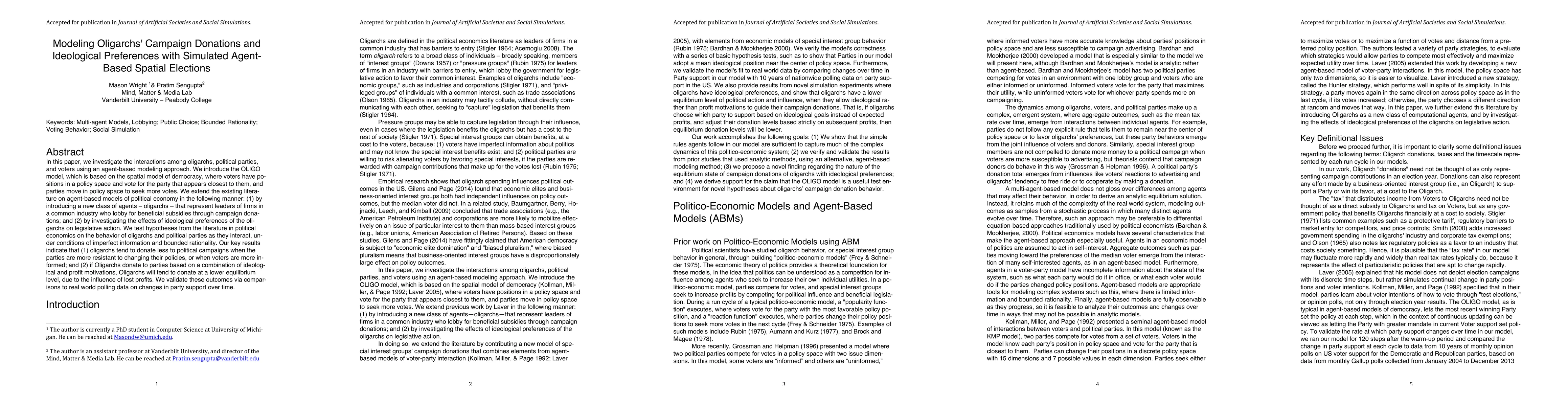 In this paper, we investigate the interactions among oligarchs, political parties, and voters using an agent-based modeling approach. We introduce the OLIGO model, which is based on the spatial model of democracy, where voters have positions in a policy space and vote for the party that appears closest to them, and parties move in policy space to seek more votes. We extend the existing literature on agent-based models of political economy in the following manner: (1) by introducing a new class of agents- oligarchs - that represent leaders of firms in a common industry who lobby for beneficial subsidies through campaign donations; and (2) by investigating the effects of ideological preferences of the oligarchs on legislative action. We test hypotheses from the literature in political economics on the behavior of oligarchs and political parties as they interact, under conditions of imperfect information and bounded rationality. Our key results indicate that (1) oligarchs tend to donate less to political campaigns when the parties are more resistant to changing their policies, or when voters are more informed; and (2) if Oligarchs donate to parties based on a combination of ideological and profit motivations, Oligarchs will tend to donate at a lower equilibrium level, due to the influence of lost profits. We validate these outcomes via comparisons to real world polling data on changes in party support over time.