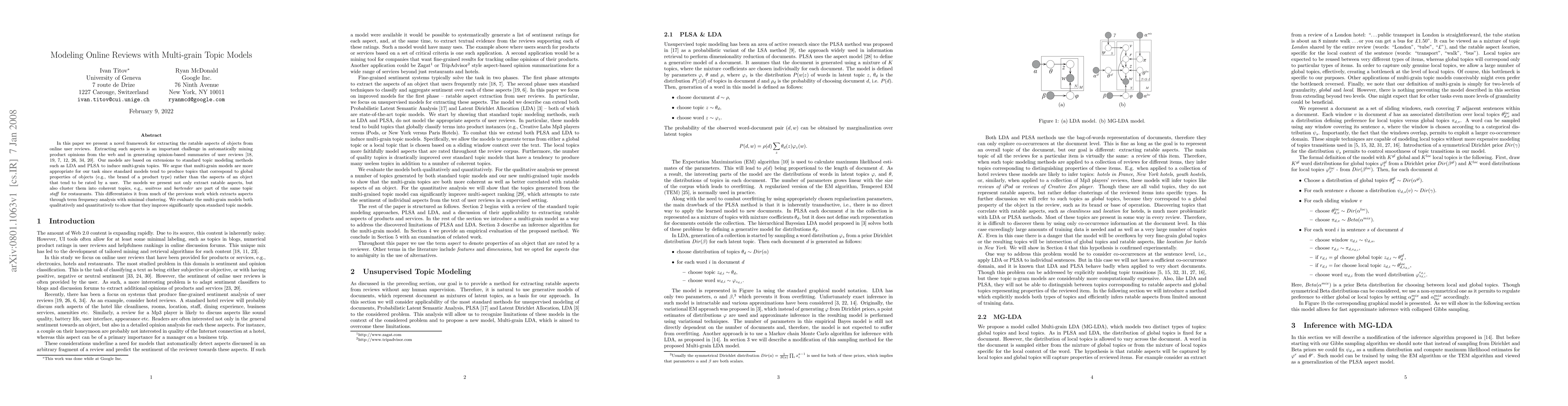 This paper introduces a novel framework using multi-grain topic models to extract ratable aspects from online reviews, improving upon standard topic models by clustering aspects into coherent topics. The evaluation demonstrates significant improvements over traditional methods in both qualitative and quantitative measures.