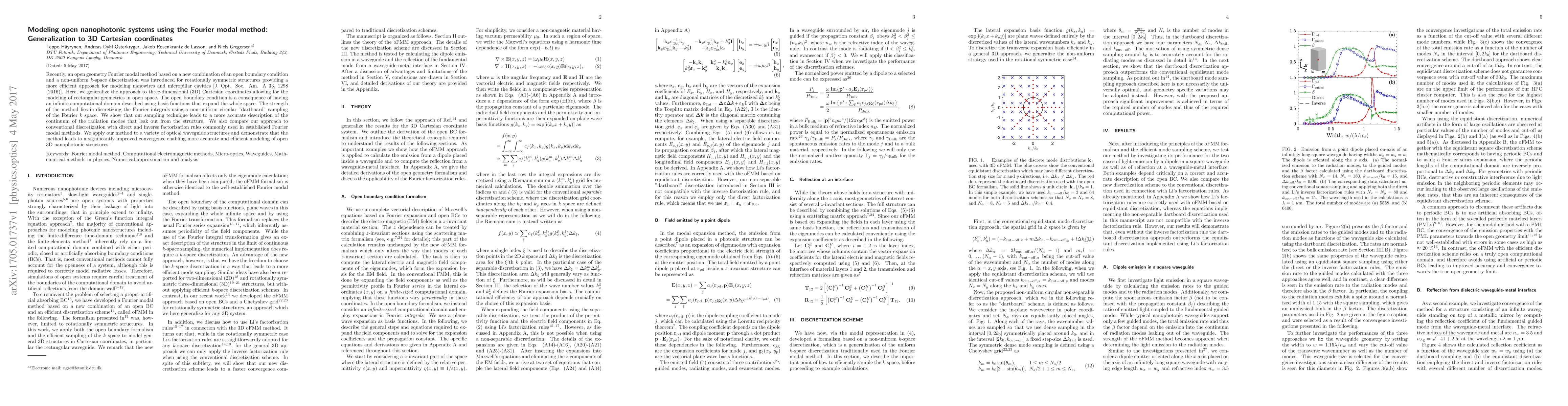 This paper generalizes the Fourier modal method for 3D Cartesian coordinates to model open nanophotonic systems, improving efficiency and accuracy for rectangular geometries in open space. The method employs a non-uniform "dartboard" sampling of Fourier $k$ space, demonstrating better convergence and more precise modeling compared to conventional methods.