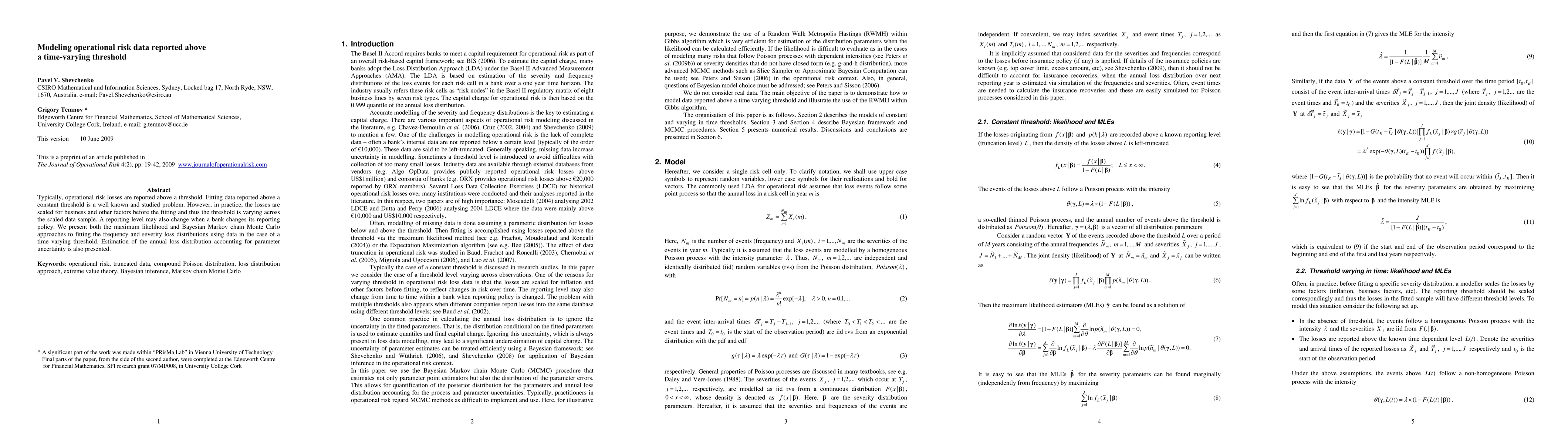 This paper presents two approaches to modeling operational risk data with a time-varying threshold, using maximum likelihood and Bayesian Markov chain Monte Carlo methods, to accurately estimate annual loss distributions and account for parameter uncertainty.