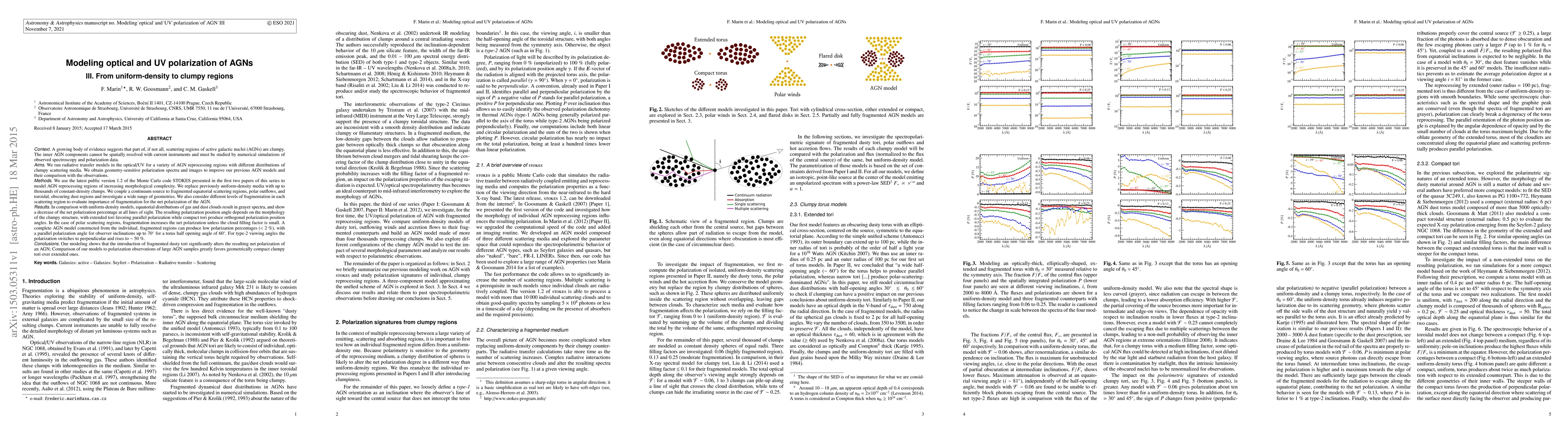 A growing body of evidence suggests that part of, if not all, scattering regions of active galactic nuclei (AGNs) are clumpy. Hence. in this paper, we run radiative transfer models in the optical/UV for a variety of AGN reprocessing regions with different distributions of clumpy scattering media. We use the latest version of the Monte Carlo code STOKES presented in the first two papers of this series to model AGN reprocessing regions of increasing morphological complexity. We replace previously uniform-density media with up to thousands of constant-density clumps. We couple a continuum source to fragmented equatorial scattering regions, polar outflows, and toroidal, obscuring dust regions and investigate a wide range of geometries. We also consider different levels of fragmentation in each scattering region to evaluate importance of fragmentation for the net polarization of the AGN. We find that, in comparison with uniform-density models, equatorial distributions of gas and dust clouds result in grayer spectra, and show a decrease of the net polarization percentage at all lines of sight. The resulting polarization position angle depends on the morphology of the clumpy structure, with extended tori favoring parallel polarization while compact tori produce orthogonal polarization position angles. In the case of polar scattering regions, fragmentation increases the net polarization unless the cloud filling factor is small. A complete set of AGN models constructed from the individual, fragmented regions is investigated. Our modeling shows that the introduction of fragmented dusty tori significantly alters the resulting net polarization of an AGN. Comparison of our models to polarization observations of large AGN samples greatly favors geometrically compact clumpy tori over extended ones.
