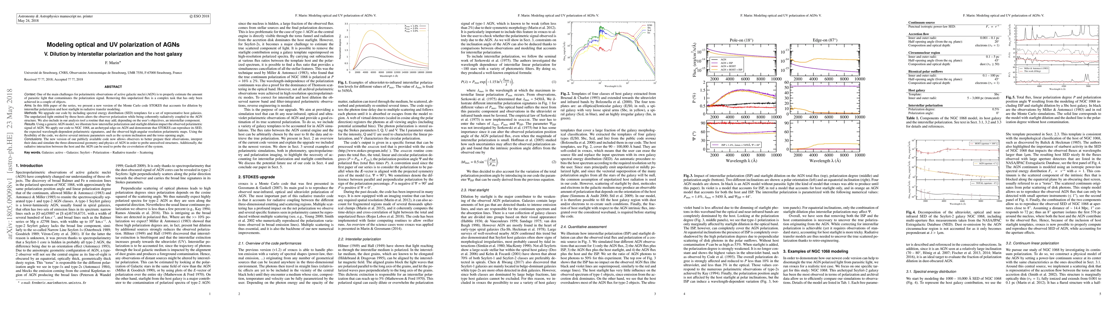 One of the main challenges for polarimetric observations of active galactic nuclei (AGN) is to properly estimate the amount of parasitic light that contaminates the polarization signal. Removing this unpolarized flux is a complex task that has only been achieved in a couple of objects. In this fifth paper of the series, we present a new version of the Monte Carlo code STOKES that accounts for dilution by interstellar polarization and host starlight in radiative transfer modeling. We upgrade our code by including spectral energy distribution (SED) templates for a set of representative host galaxies. The unpolarized light emitted by those hosts alters the observer polarization while being coherently radiatively coupled to the AGN structure. We also include in our analysis tool a routine that may add, depending on the user's objectives, an interstellar component. Using a generic AGN model, we illustrate how interstellar polarization and starlight dilution impact the observed polarimetric signal of AGN. We apply our code to NGC-1068, an archetypal edge-on AGN and demonstrate that STOKES can reproduce its SED, the expected wavelength-dependent polarimetric signatures, and the observed high-angular resolution polarimetric maps. Using the flexibility of the code, we derive several intrinsic parameters such as the system inclination and the torus opening angle. The new version of our publicly available code now allows observers to better prepare their observations, interpret their data and simulate the three-dimensional geometry and physics of AGN in order to probe unresolved structures. Additionally, the radiative interaction between the host and the AGN can be used to probe the co-evolution of the system.