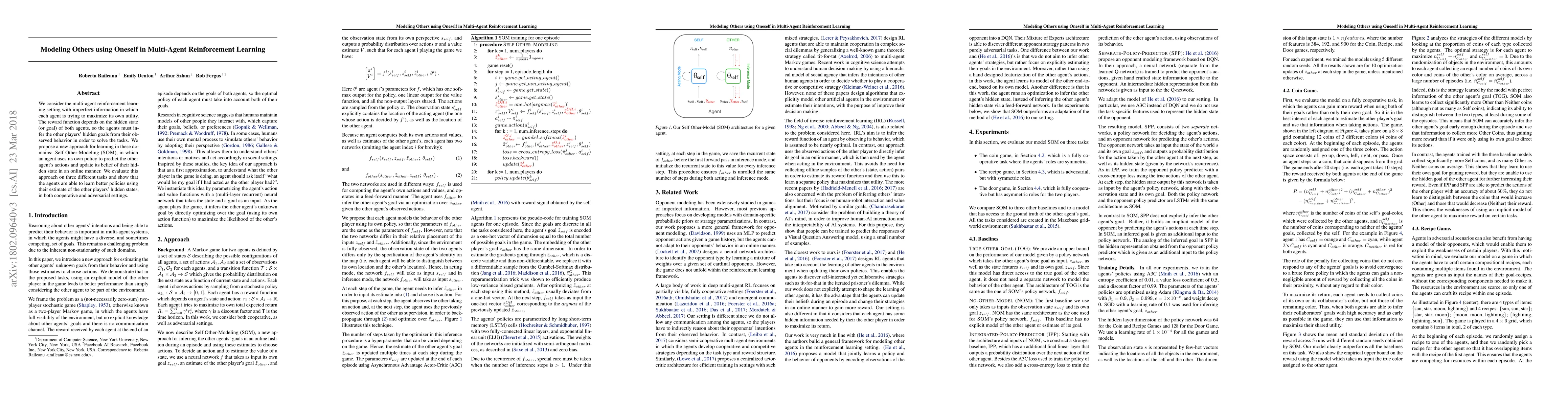 Researchers propose a new approach to learning in multi-agent reinforcement learning called Self Other-Modeling (SOM), which enables agents to predict other agents' actions and improve their own policies with estimated hidden states.