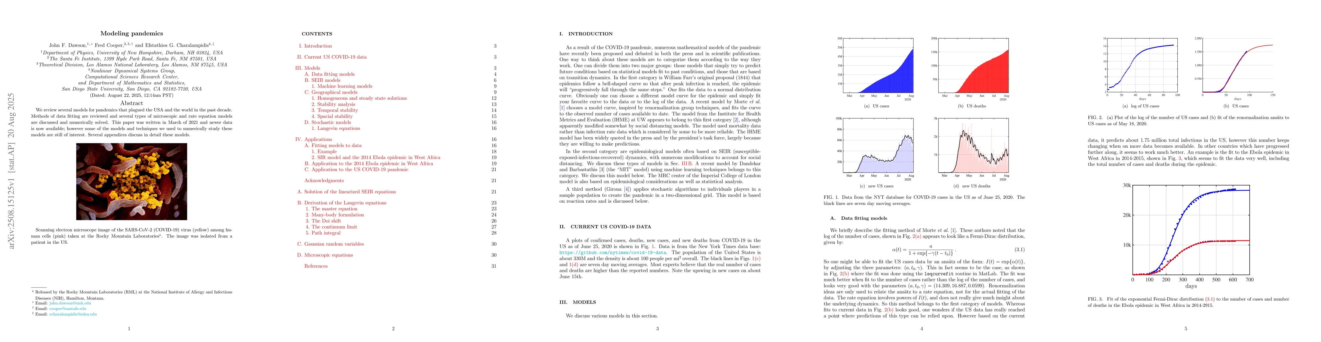 We review several models for pandemics that plagued the USA and the world in the past decade. Methods of data fitting are reviewed and several types of microscopic and rate equation models are discussed and numerically solved. This paper was written in March of 2021 and newer data is now available; however some of the models and techniques we used to numerically study these models are still of interest. Several appendices discuss in detail these models.