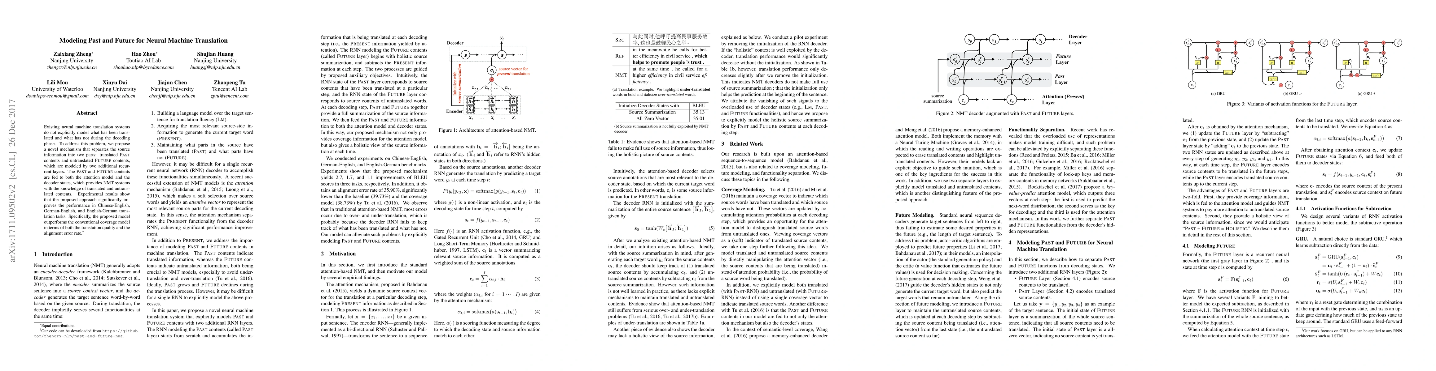 Existing neural machine translation systems do not explicitly model what has been translated and what has not during the decoding phase. To address this problem, we propose a novel mechanism that separates the source information into two parts: translated Past contents and untranslated Future contents, which are modeled by two additional recurrent layers. The Past and Future contents are fed to both the attention model and the decoder states, which offers NMT systems the knowledge of translated and untranslated contents. Experimental results show that the proposed approach significantly improves translation performance in Chinese-English, German-English and English-German translation tasks. Specifically, the proposed model outperforms the conventional coverage model in both of the translation quality and the alignment error rate.
