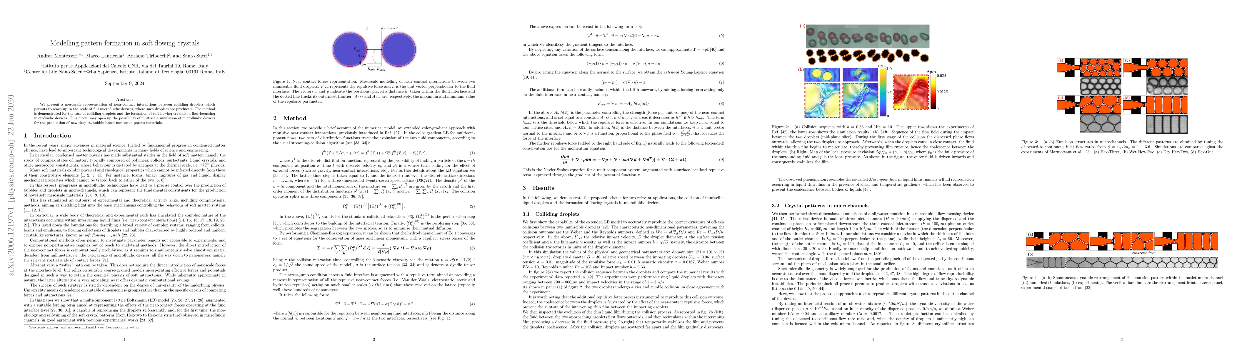 This paper introduces a mesoscale model for simulating near-contact interactions between colliding droplets in microfluidic devices, demonstrating its application in forming soft flowing crystals. The model has potential for multiscale simulations to produce new porous materials.