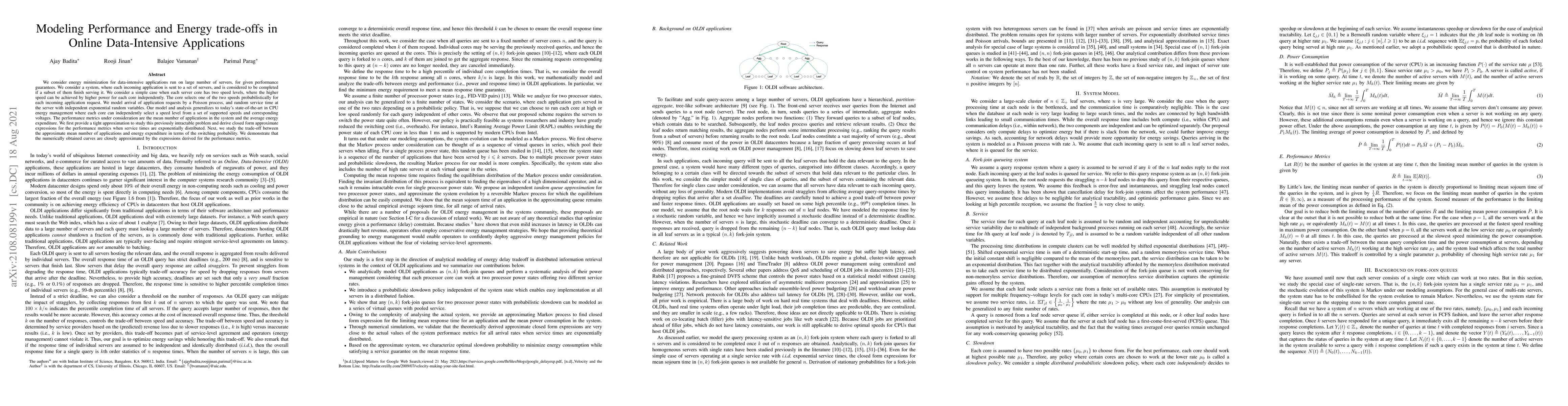 This paper models energy minimization in data-intensive applications running on multiple servers, focusing on performance guarantees and energy efficiency. It provides a tight approximation for performance metrics and explores the trade-off between application throughput and energy expenditure based on core speed selection probabilities.