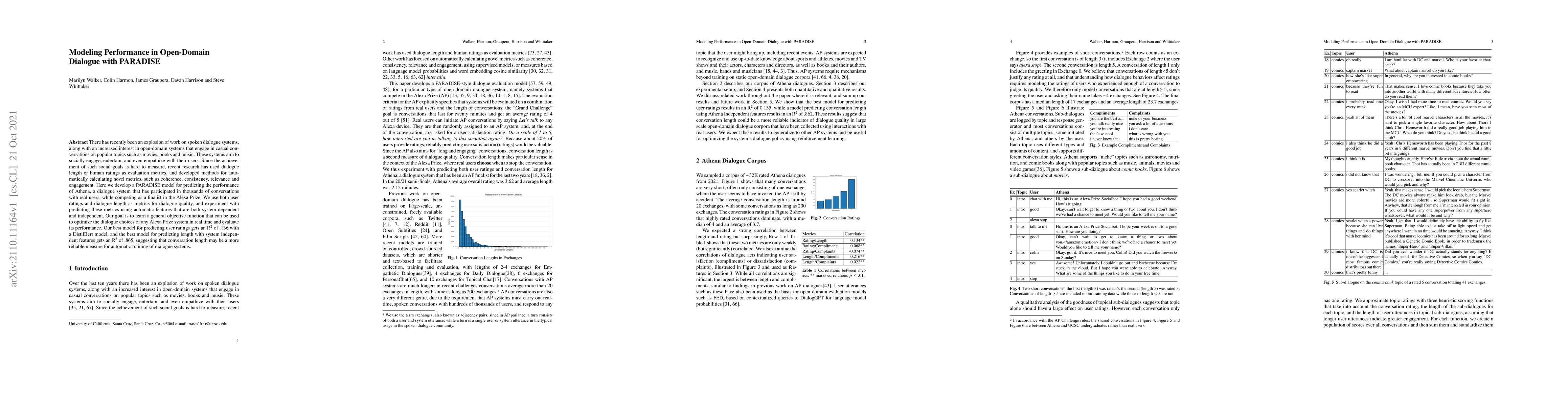 There has recently been an explosion of work on spoken dialogue systems, along with an increased interest in open-domain systems that engage in casual conversations on popular topics such as movies, books and music. These systems aim to socially engage, entertain, and even empathize with their users. Since the achievement of such social goals is hard to measure, recent research has used dialogue length or human ratings as evaluation metrics, and developed methods for automatically calculating novel metrics, such as coherence, consistency, relevance and engagement. Here we develop a PARADISE model for predicting the performance of Athena, a dialogue system that has participated in thousands of conversations with real users, while competing as a finalist in the Alexa Prize. We use both user ratings and dialogue length as metrics for dialogue quality, and experiment with predicting these metrics using automatic features that are both system dependent and independent. Our goal is to learn a general objective function that can be used to optimize the dialogue choices of any Alexa Prize system in real time and evaluate its performance. Our best model for predicting user ratings gets an R$^2$ of .136 with a DistilBert model, and the best model for predicting length with system independent features gets an R$^2$ of .865, suggesting that conversation length may be a more reliable measure for automatic training of dialogue systems.
