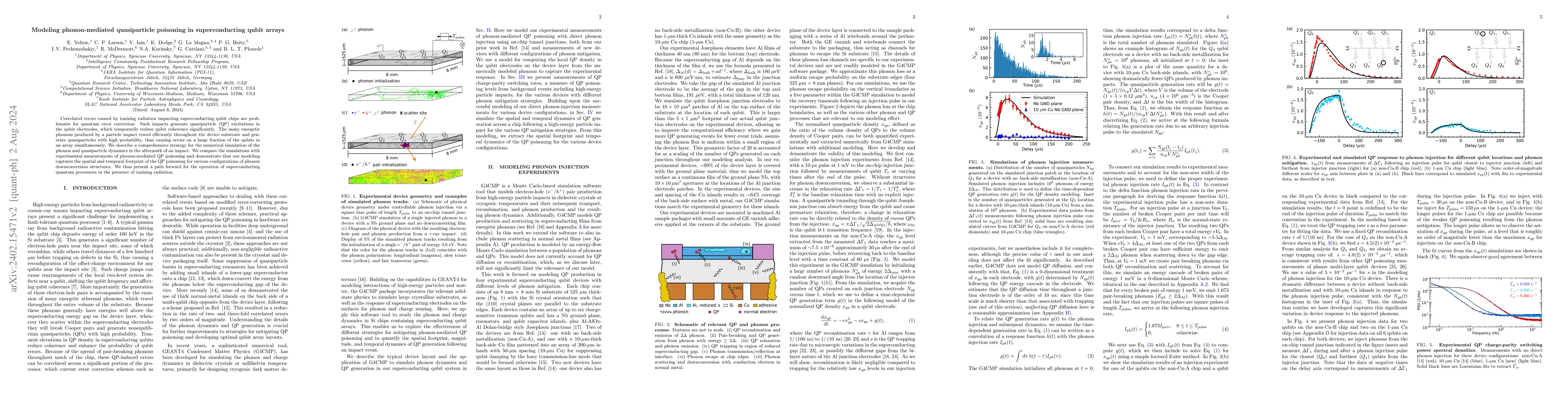 This paper models phonon-mediated quasiparticle poisoning in superconducting qubit arrays caused by ionizing radiation, simulating the dynamics of phonons and quasiparticles to understand correlated errors. The study validates the model against experimental data, providing insights for quantum processors operating under radiation.
