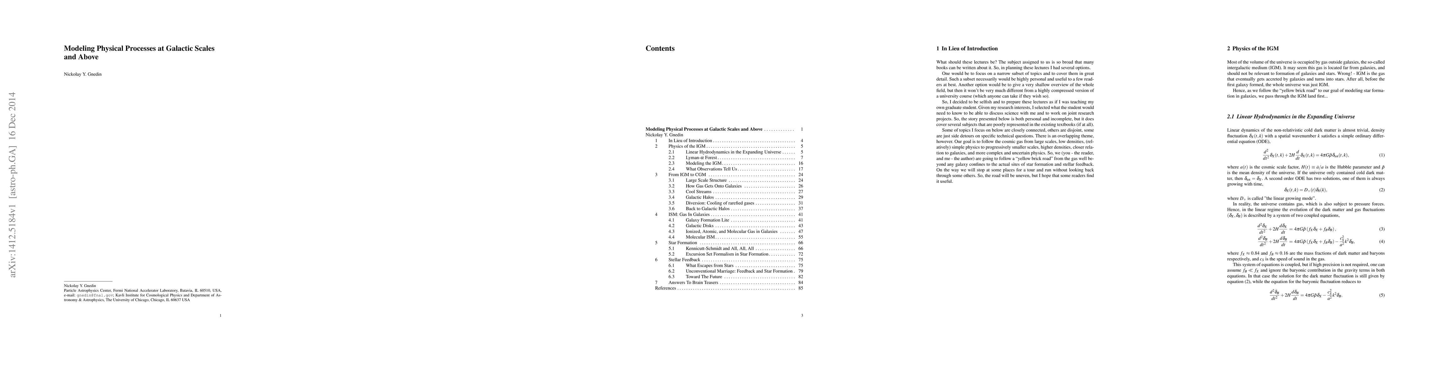 What should these lectures be? The subject assigned to us is so broad that many books can be written about it. So, in planning these lectures I had several options. One would be to focus on a narrow subset of topics and to cover them in great detail. Such a subset necessarily would be highly personal and useful to a few read- ers at best. Another option would be to give a very shallow overview of the whole field, but then it won't be very much different from a highly compressed version of a university course (which anyone can take if they wish so). So, I decided to be selfish and to prepare these lectures as if I was teaching my own graduate student. Given my research interests, I selected what the student would need to know to be able to discuss science with me and to work on joint research projects. So, the story presented below is both personal and incomplete, but it does cover several subjects that are poorly represented in the existing textbooks (if at all). Some of topics I focus on below are closely connected, others are disjoint, some are just side detours on specific technical questions. There is an overlapping theme, however. Our goal is to follow the cosmic gas from large scales, low densities, (rel- atively) simple physics to progressively smaller scales, higher densities, closer rela- tion to galaxies, and more complex and uncertain physics. So, we (you - the reader, and me - the author) are going to follow a "yellow brick road" from the gas well be- yond any galaxy confines to the actual sites of star formation and stellar feedback. On the way we will stop at some places for a tour and run without looking back through some others. So, the road will be uneven, but I hope that some readers find it useful.