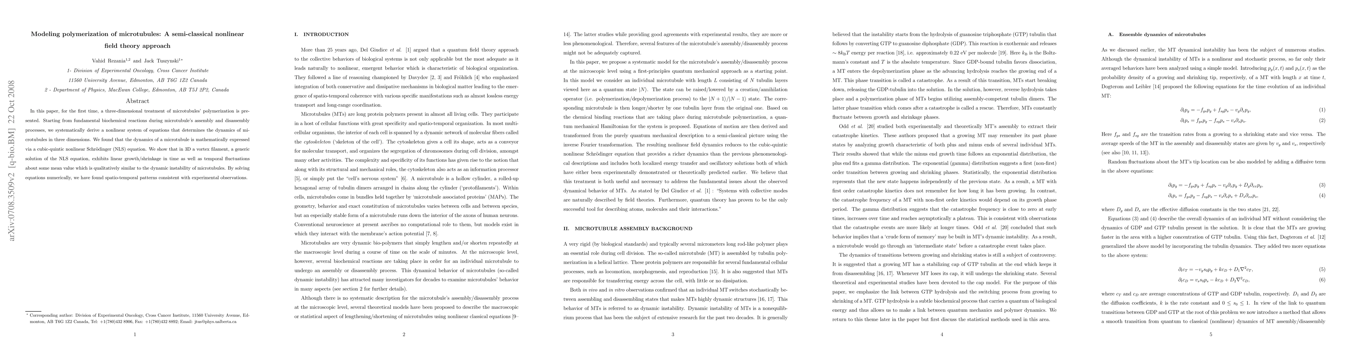 This paper proposes a quantum mechanical model for microtubule polymerization using creation and annihilation operators, deriving a cubic-quintic nonlinear Schrödinger equation to describe microtubule dynamics. The model shows that microtubules exhibit dynamic instability, akin to vortex filaments in the NLS equation.