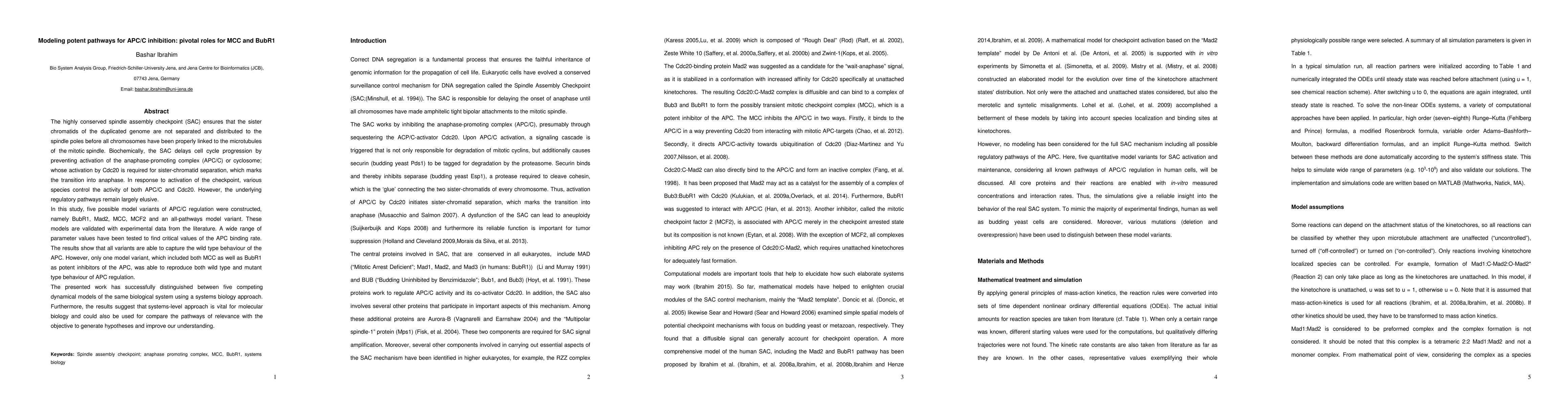 This study models the regulation of the anaphase-promoting complex (APC/C) by constructing and validating five biochemical pathway variants, including BubR1 and MCC. Only the model incorporating both MCC and BubR1 accurately reproduced wild type and mutant behavior, highlighting their pivotal roles in APC/C inhibition and suggesting a systems biology approach is crucial for understanding complex biological processes.