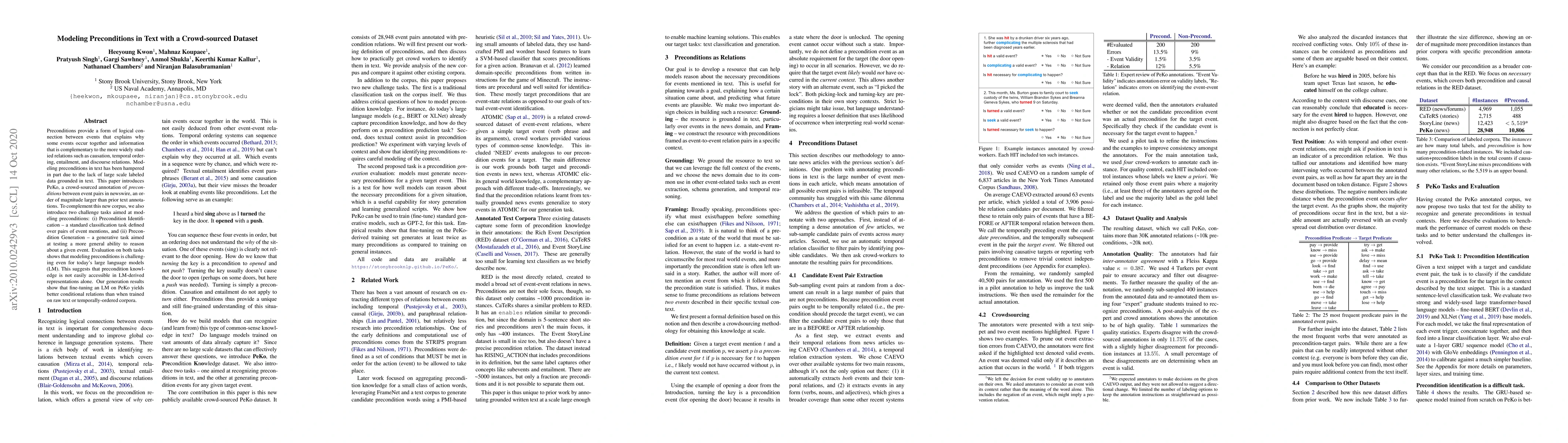 Preconditions provide a form of logical connection between events that explains why some events occur together and information that is complementary to the more widely studied relations such as causation, temporal ordering, entailment, and discourse relations. Modeling preconditions in text has been hampered in part due to the lack of large scale labeled data grounded in text. This paper introduces PeKo, a crowd-sourced annotation of preconditions between event pairs in newswire, an order of magnitude larger than prior text annotations. To complement this new corpus, we also introduce two challenge tasks aimed at modeling preconditions: (i) Precondition Identification -- a standard classification task defined over pairs of event mentions, and (ii) Precondition Generation -- a generative task aimed at testing a more general ability to reason about a given event. Evaluation on both tasks shows that modeling preconditions is challenging even for today's large language models (LM). This suggests that precondition knowledge is not easily accessible in LM-derived representations alone. Our generation results show that fine-tuning an LM on PeKo yields better conditional relations than when trained on raw text or temporally-ordered corpora.