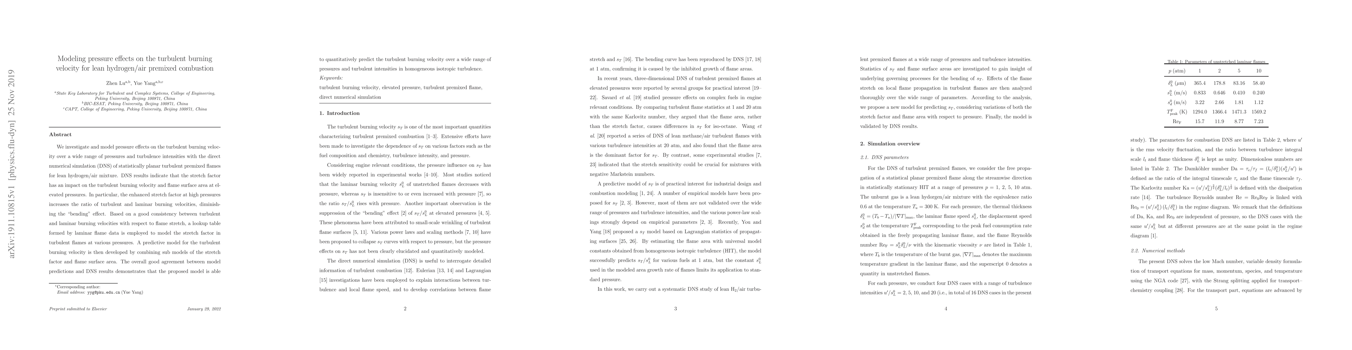 This paper models pressure effects on the turbulent burning velocity for lean hydrogen/air premixed combustion using direct numerical simulations. The study finds that the stretch factor significantly impacts turbulent burning velocity at high pressures, leading to a predictive model that accurately captures these effects across various pressures and turbulence intensities.