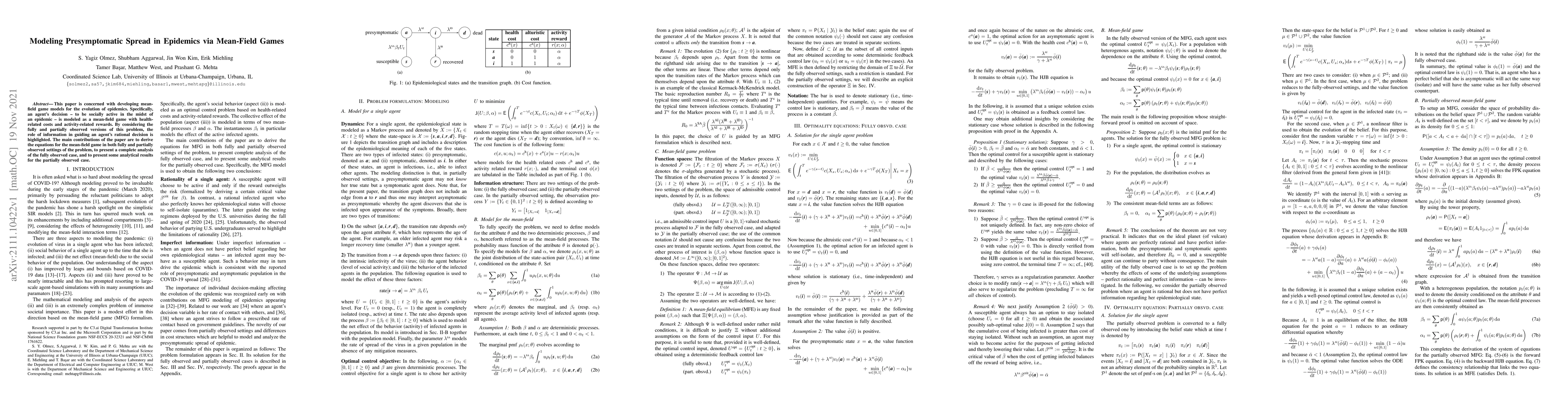 This paper develops mean-field game models to study the presymptomatic spread of epidemics, focusing on agents' social activity decisions under health costs and rewards. It provides equations and analyses for both fully and partially observed scenarios, highlighting the role of information in guiding rational decisions.