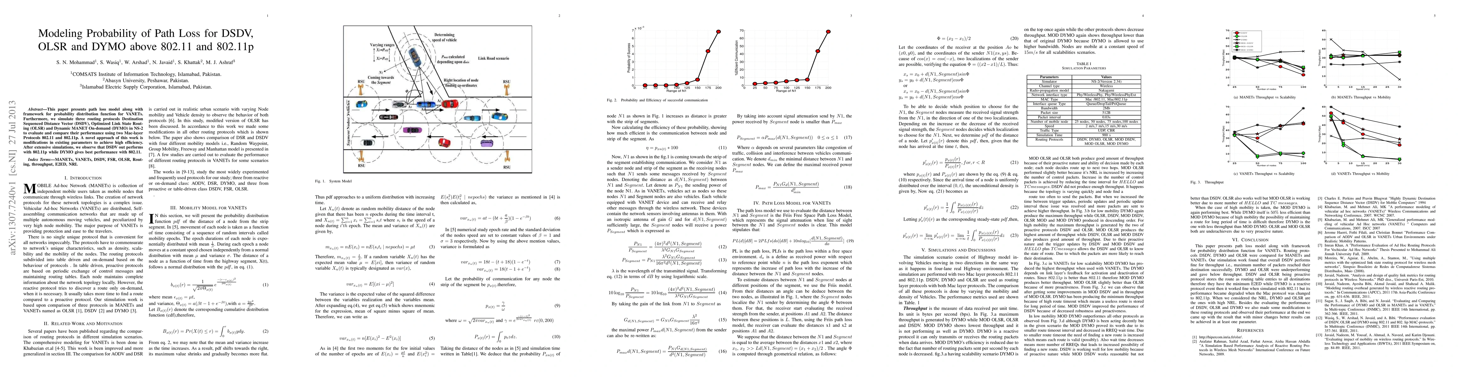 This paper presents path loss model along with framework for probability distribution function for VANETs. Furthermore, we simulate three routing protocols Destination Sequenced Distance Vector (DSDV), Optimized Link State Routing (OLSR) and Dynamic MANET On-demand (DYMO) in NS-2 to evaluate and compare their performance using two Mac-layer Protocols 802.11 and 802.11p. A novel approach of this work is modifications in existing parameters to achieve high efficiency. After extensive simulations, we observe that DSDV out performs with 802.11p while DYMO gives best performance with 802.11.
