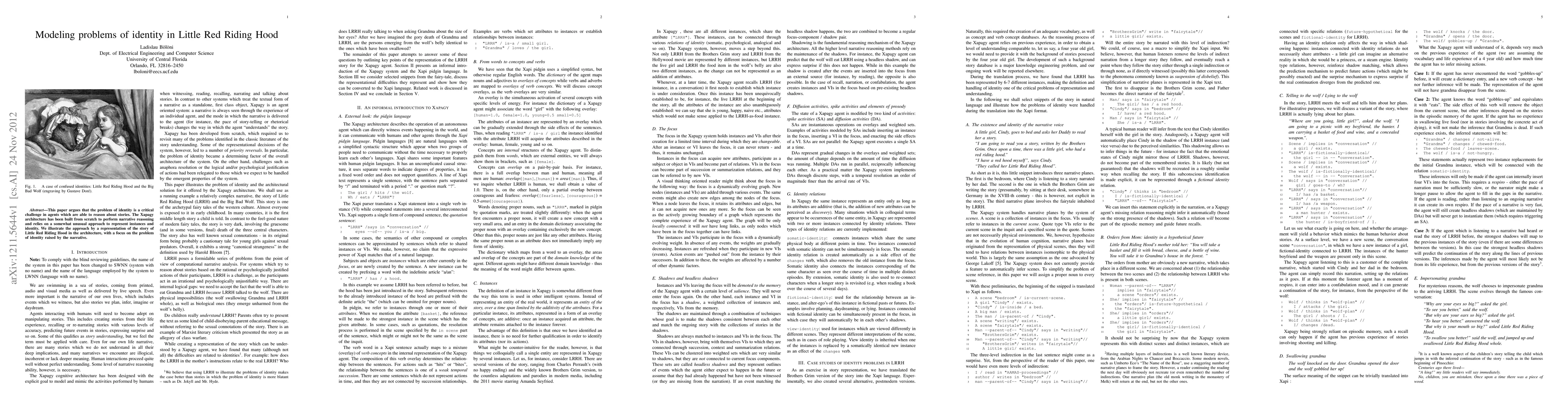 This paper argues that the problem of identity is a critical challenge in agents which are able to reason about stories. The Xapagy architecture has been built from scratch to perform narrative reasoning and relies on a somewhat unusual approach to represent instances and identity. We illustrate the approach by a representation of the story of Little Red Riding Hood in the architecture, with a focus on the problem of identity raised by the narrative.