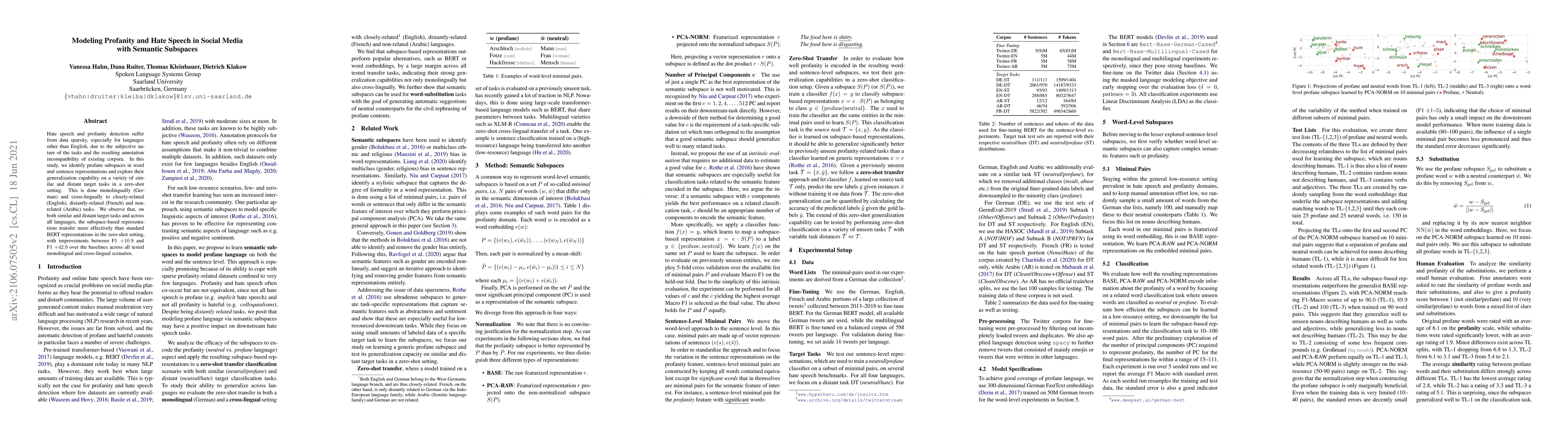 Hate speech and profanity detection suffer from data sparsity, especially for languages other than English, due to the subjective nature of the tasks and the resulting annotation incompatibility of existing corpora. In this study, we identify profane subspaces in word and sentence representations and explore their generalization capability on a variety of similar and distant target tasks in a zero-shot setting. This is done monolingually (German) and cross-lingually to closely-related (English), distantly-related (French) and non-related (Arabic) tasks. We observe that, on both similar and distant target tasks and across all languages, the subspace-based representations transfer more effectively than standard BERT representations in the zero-shot setting, with improvements between F1 +10.9 and F1 +42.9 over the baselines across all tested monolingual and cross-lingual scenarios.