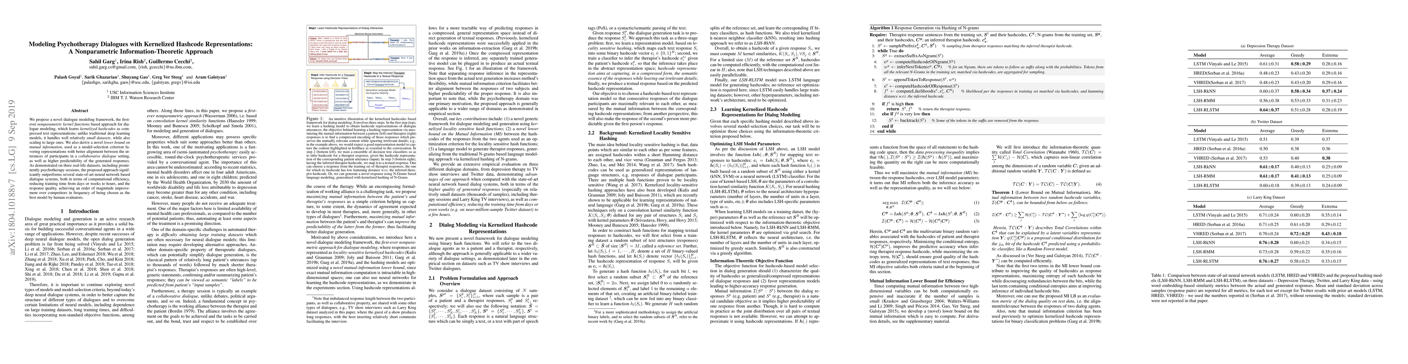 We propose a novel dialogue modeling framework, the first-ever nonparametric kernel functions based approach for dialogue modeling, which learns kernelized hashcodes as compressed text representations; unlike traditional deep learning models, it handles well relatively small datasets, while also scaling to large ones. We also derive a novel lower bound on mutual information, used as a model-selection criterion favoring representations with better alignment between the utterances of participants in a collaborative dialogue setting, as well as higher predictability of the generated responses. As demonstrated on three real-life datasets, including prominently psychotherapy sessions, the proposed approach significantly outperforms several state-of-art neural network based dialogue systems, both in terms of computational efficiency, reducing training time from days or weeks to hours, and the response quality, achieving an order of magnitude improvement over competitors in frequency of being chosen as the best model by human evaluators.