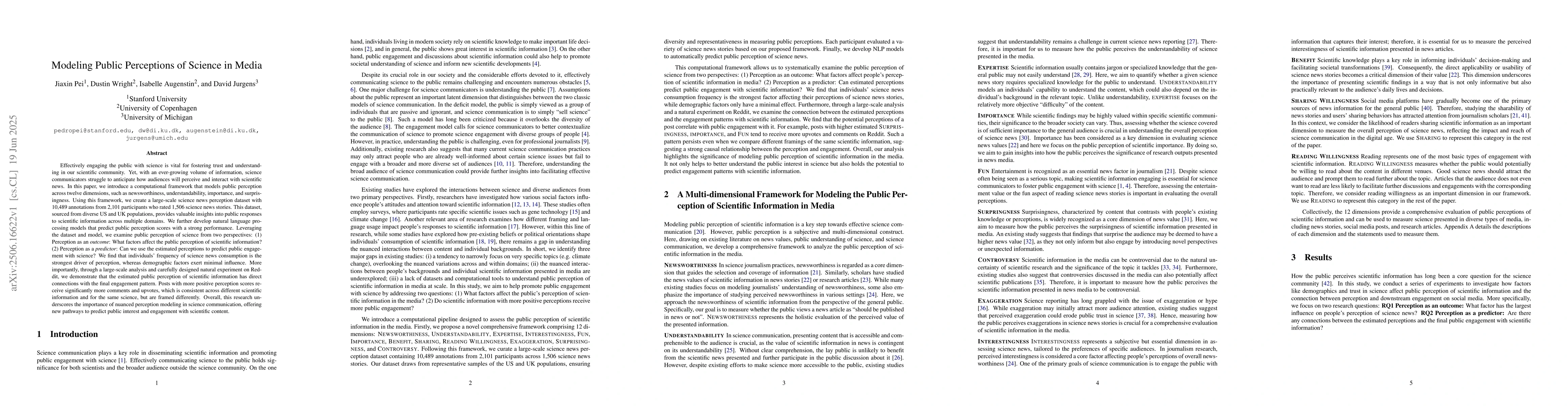 Effectively engaging the public with science is vital for fostering trust and understanding in our scientific community. Yet, with an ever-growing volume of information, science communicators struggle to anticipate how audiences will perceive and interact with scientific news. In this paper, we introduce a computational framework that models public perception across twelve dimensions, such as newsworthiness, importance, and surprisingness. Using this framework, we create a large-scale science news perception dataset with 10,489 annotations from 2,101 participants from diverse US and UK populations, providing valuable insights into public responses to scientific information across domains. We further develop NLP models that predict public perception scores with a strong performance. Leveraging the dataset and model, we examine public perception of science from two perspectives: (1) Perception as an outcome: What factors affect the public perception of scientific information? (2) Perception as a predictor: Can we use the estimated perceptions to predict public engagement with science? We find that individuals' frequency of science news consumption is the driver of perception, whereas demographic factors exert minimal influence. More importantly, through a large-scale analysis and carefully designed natural experiment on Reddit, we demonstrate that the estimated public perception of scientific information has direct connections with the final engagement pattern. Posts with more positive perception scores receive significantly more comments and upvotes, which is consistent across different scientific information and for the same science, but are framed differently. Overall, this research underscores the importance of nuanced perception modeling in science communication, offering new pathways to predict public interest and engagement with scientific content.