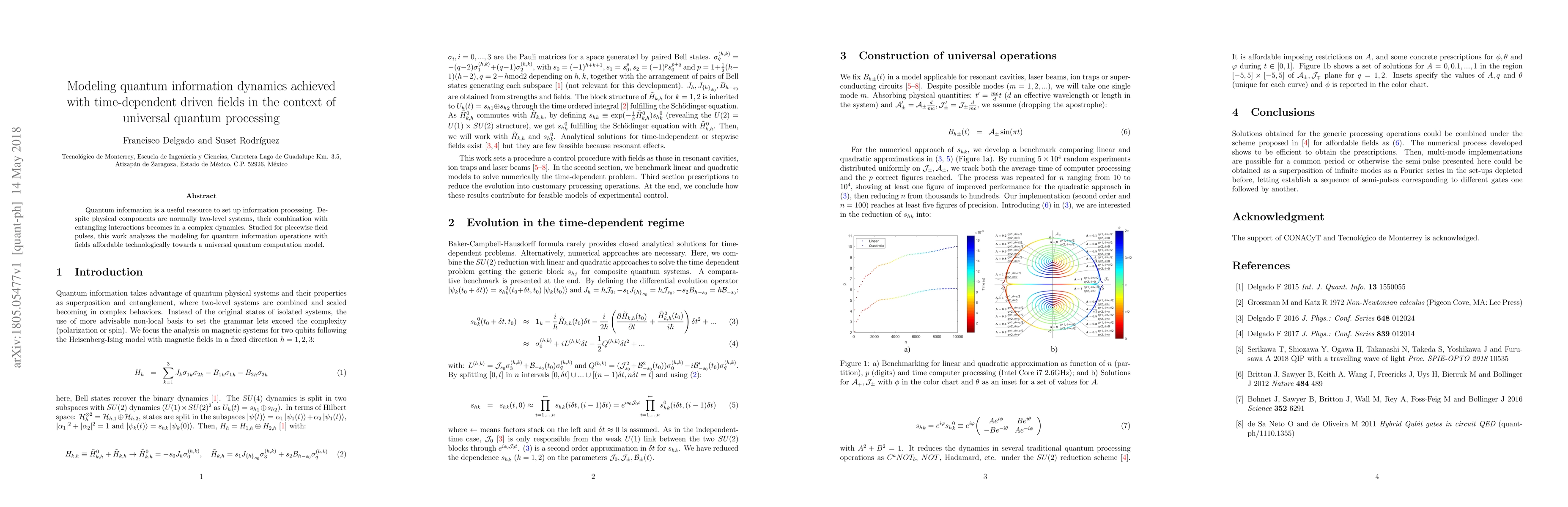 This paper explores the dynamics of quantum information processing using time-dependent driven fields, focusing on the technological feasibility of implementing piecewise field pulses for universal quantum computation. The study aims to model complex dynamics arising from entangling interactions in two-level quantum systems.