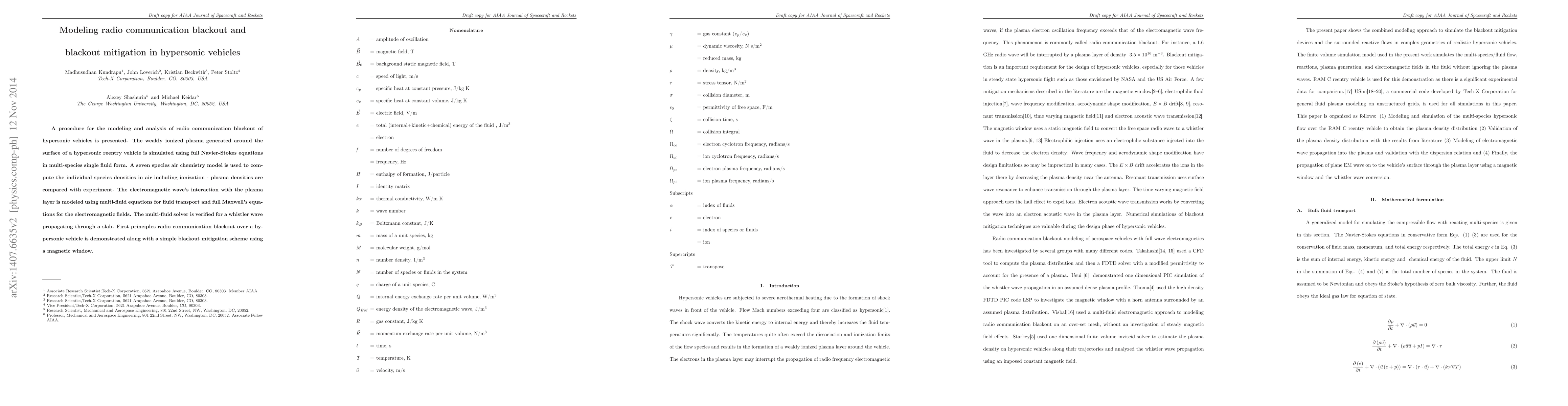 This paper models radio communication blackout in hypersonic vehicles due to weakly ionized plasma, using full Navier-Stokes equations and a seven-species air chemistry model. It demonstrates a mitigation technique involving a magnetic window to restore communication.