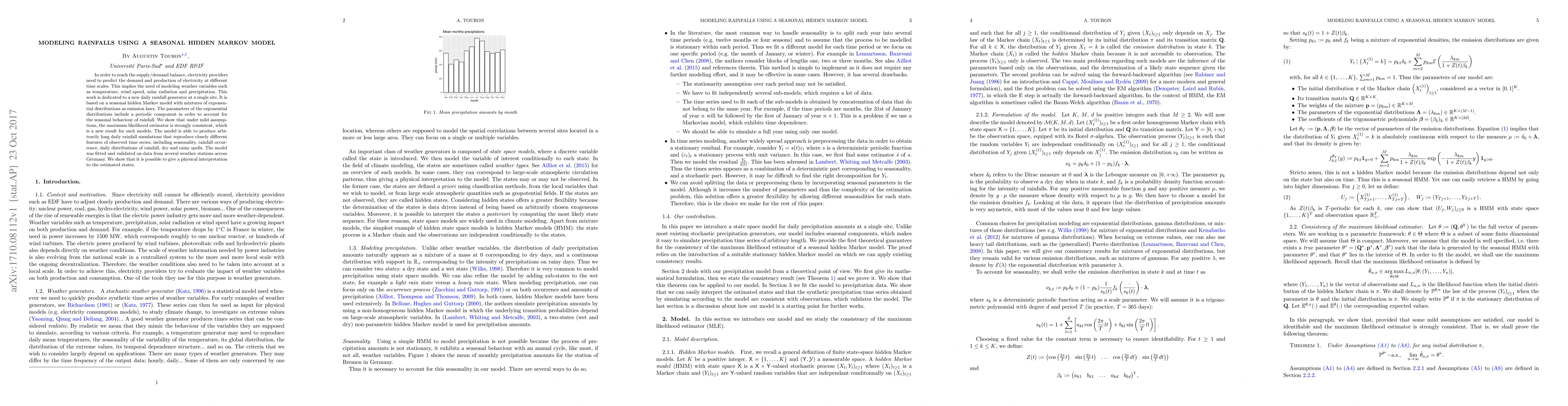 In order to reach the supply/demand balance, electricity providers need to predict the demand and production of electricity at different time scales. This implies the need of modeling weather variables such as temperature, wind speed, solar radiation and precipitation. This work is dedicated to a new daily rainfall generator at a single site. It is based on a seasonal hidden Markov model with mixtures of exponential distributions as emission laws. The parameters of the exponential distributions include a periodic component in order to account for the seasonal behaviour of rainfall. We show that under mild assumptions , the maximum likelihood estimator is strongly consistent, which is a new result for such models. The model is able to produce arbitrarily long daily rainfall simulations that reproduce closely different features of observed time series, including seasonality, rainfall occurrence , daily distributions of rainfall, dry and rainy spells. The model was fitted and validated on data from several weather stations across Germany. We show that it is possible to give a physical interpretation to the estimated states.
