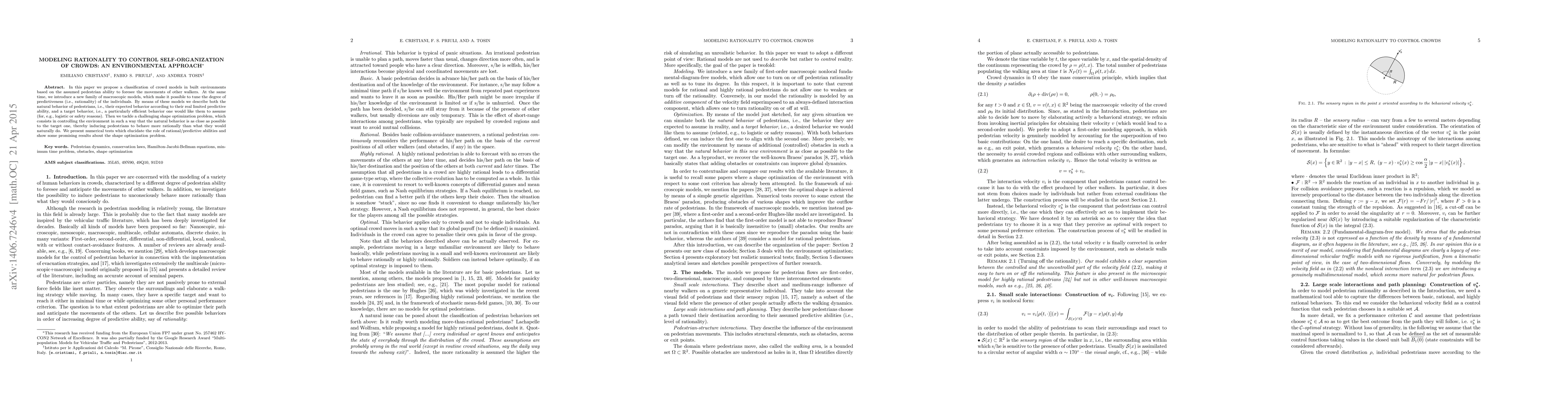 In this paper we propose a classification of crowd models in built environments based on the assumed pedestrian ability to foresee the movements of other walkers. At the same time, we introduce a new family of macroscopic models, which make it possible to tune the degree of predictiveness (i.e., rationality) of the individuals. By means of these models we describe both the natural behavior of pedestrians, i.e., their expected behavior according to their real limited predictive ability, and a target behavior, i.e., a particularly efficient behavior one would like them to assume (for, e.g., logistic or safety reasons). Then we tackle a challenging shape optimization problem, which consists in controlling the environment in such a way that the natural behavior is as close as possible to the target one, thereby inducing pedestrians to behave more rationally than what they would naturally do. We present numerical tests which elucidate the role of rational/predictive abilities and show some promising results about the shape optimization problem.