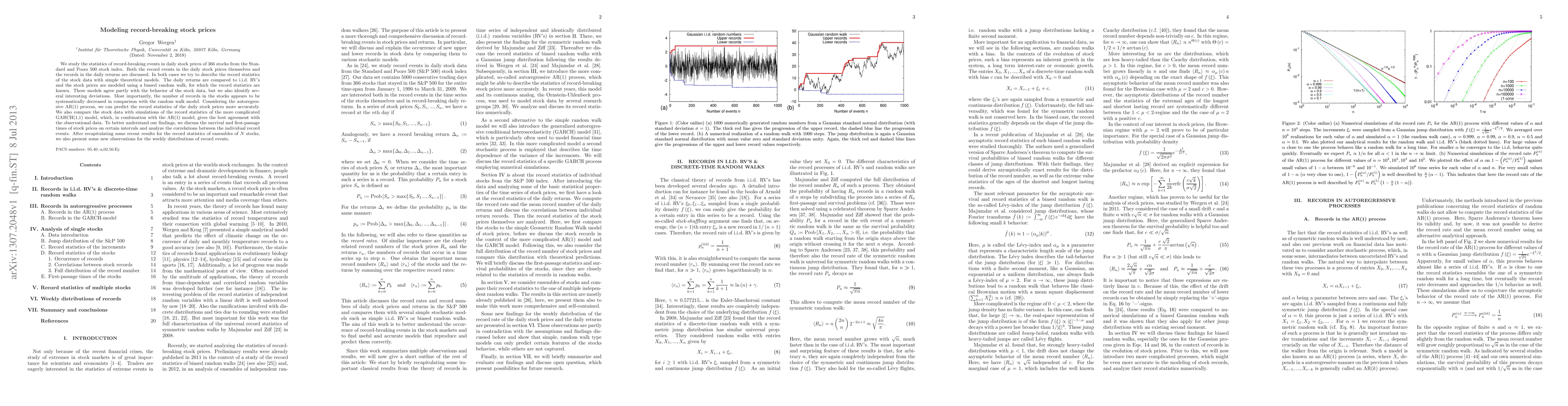 We study the statistics of record-breaking events in daily stock prices of 366 stocks from the Standard and Poors 500 stock index. Both the record events in the daily stock prices themselves and the records in the daily returns are discussed. In both cases we try to describe the record statistics of the stock data with simple theoretical models. The daily returns are compared to i.i.d. RV's and the stock prices are modeled using a biased random walk, for which the record statistics are known. These models agree partly with the behavior of the stock data, but we also identify several interesting deviations. Most importantly, the number of records in the stocks appears to be systematically decreased in comparison with the random walk model. Considering the autoregressive AR(1) process, we can predict the record statistics of the daily stock prices more accurately. We also compare the stock data with simulations of the record statistics of the more complicated GARCH(1,1) model, which, in combination with the AR(1) model, gives the best agreement with the observational data. To better understand our findings, we discuss the survival and first-passage times of stock prices on certain intervals and analyze the correlations between the individual record events. After recapitulating some recent results for the record statistics of ensembles of N stocks, we also present some new observations for the weekly distributions of record events.