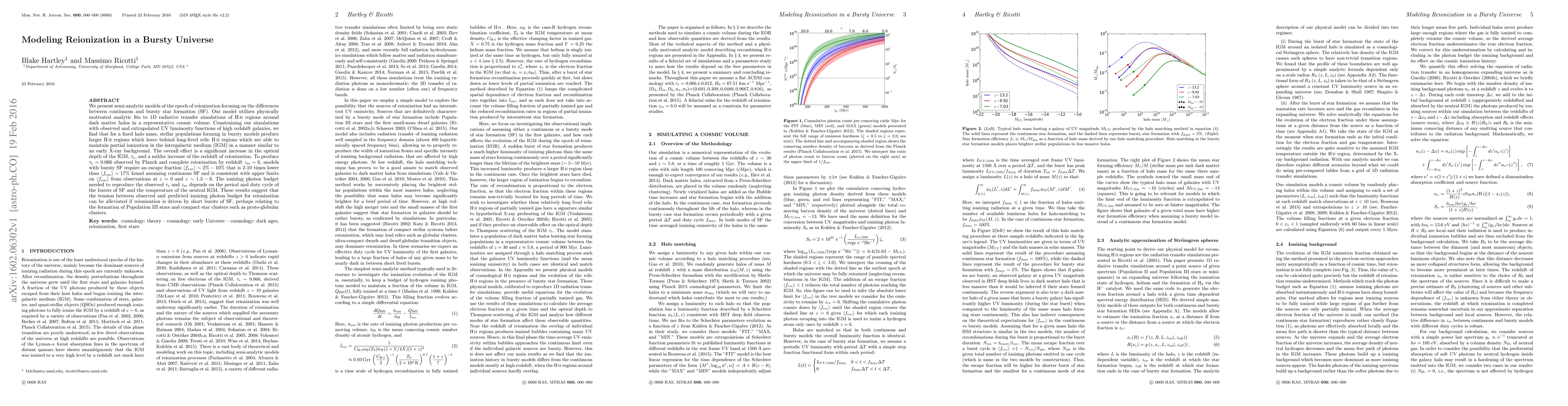 This paper models the epoch of reionization, finding that bursty star formation leads to larger, long-lasting HII regions and a higher optical depth of the intergalactic medium compared to continuous star formation. Bursty models require a lower escape fraction of ionizing photons, potentially resolving the tension in the predicted ionizing photon budget for reionization.