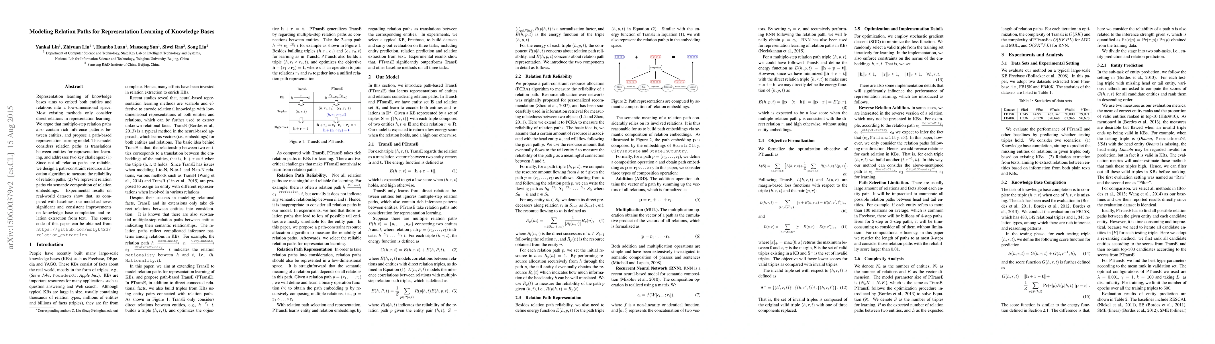 This paper proposes a path-based representation learning model for knowledge bases that embeds both entities and relations by considering multiple-step relation paths. The model addresses path reliability and semantic composition of relation embeddings, leading to significant improvements in knowledge base completion and relation extraction tasks.