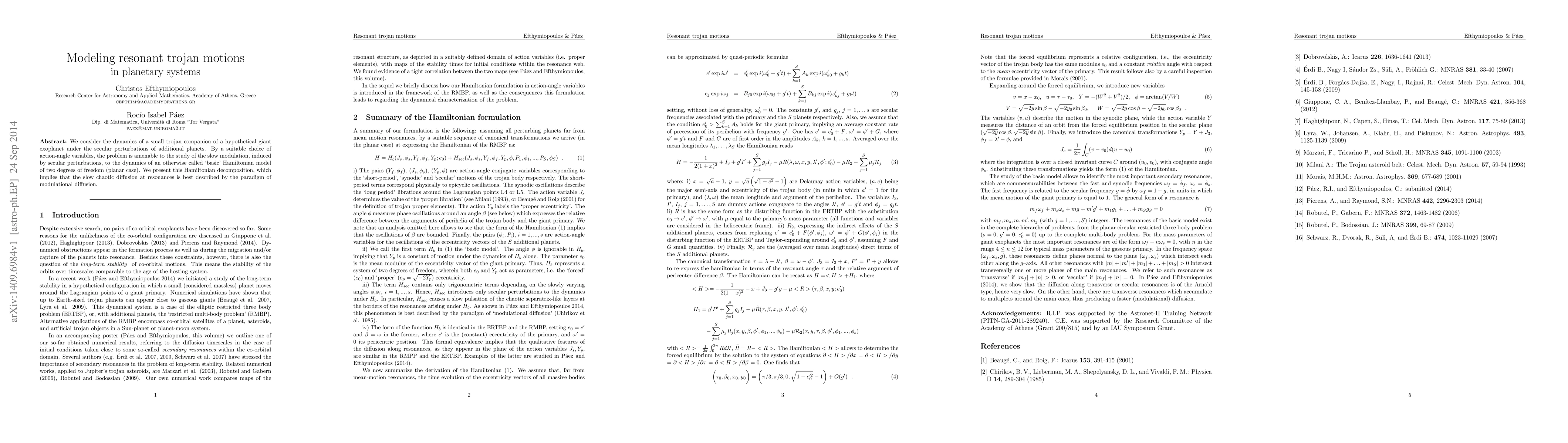 We consider the dynamics of a small trojan companion of a hypothetical giant exoplanet under the secular perturbations of additional planets. By a suitable choice of action-angle variables, the problem is amenable to the study of the slow modulation, induced by secular perturbations, to the dynamics of an otherwise called `basic' Hamiltonian model of two degrees of freedom (planar case). We present this Hamiltonian decomposition, which implies that the slow chaotic diffusion at resonances is best described by the paradigm of modulational diffusion.