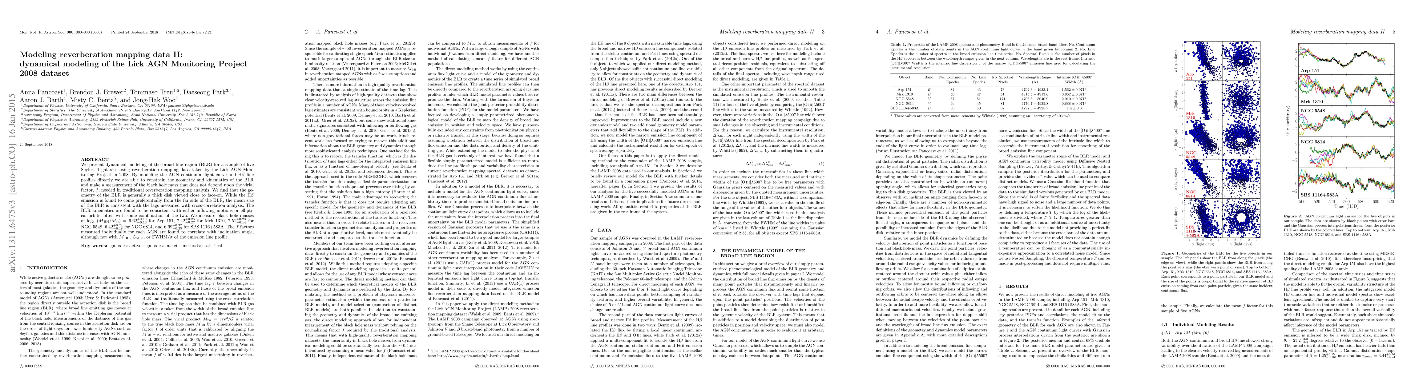 This paper models the broad line region (BLR) of five Seyfert 1 galaxies using 2008 Lick AGN Monitoring Project data, revealing a thick disk geometry and measuring black hole masses without relying on traditional virial factors. The study finds BLR kinematics consistent with inflow or elliptical orbits.