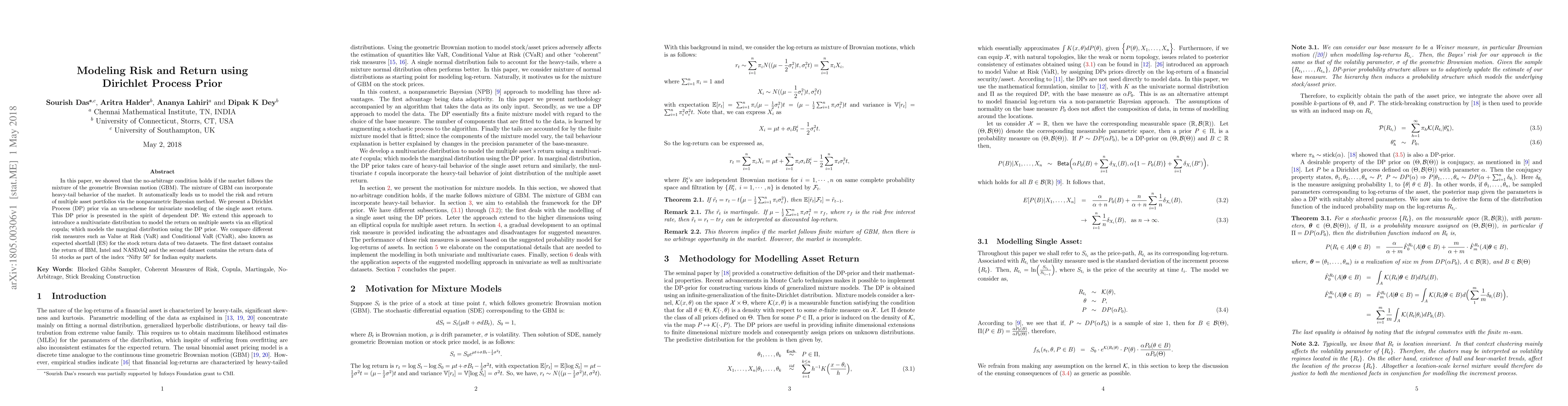 This paper models risk and return using a Dirichlet Process prior for a mixture of geometric Brownian motion, capturing heavy-tail behavior in market returns. It employs a univariate DP prior for single asset returns and extends this to a multivariate elliptical copula for multiple assets, comparing risk measures like VaR and CVaR on datasets including IBM, Intel, NASDAQ, and Nifty 50.