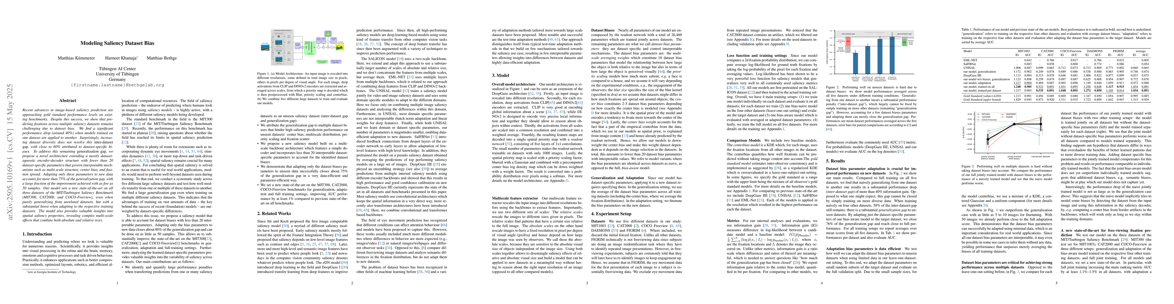 Recent advances in image-based saliency prediction are approaching gold standard performance levels on existing benchmarks. Despite this success, we show that predicting fixations across multiple saliency datasets remains challenging due to dataset bias. We find a significant performance drop (around 40%) when models trained on one dataset are applied to another. Surprisingly, increasing dataset diversity does not resolve this inter-dataset gap, with close to 60% attributed to dataset-specific biases. To address this remaining generalization gap, we propose a novel architecture extending a mostly dataset-agnostic encoder-decoder structure with fewer than 20 dataset-specific parameters that govern interpretable mechanisms such as multi-scale structure, center bias, and fixation spread. Adapting only these parameters to new data accounts for more than 75% of the generalization gap, with a large fraction of the improvement achieved with as few as 50 samples. Our model sets a new state-of-the-art on all three datasets of the MIT/Tuebingen Saliency Benchmark (MIT300, CAT2000, and COCO-Freeview), even when purely generalizing from unrelated datasets, but with a substantial boost when adapting to the respective training datasets. The model also provides valuable insights into spatial saliency properties, revealing complex multi-scale effects that combine both absolute and relative sizes.