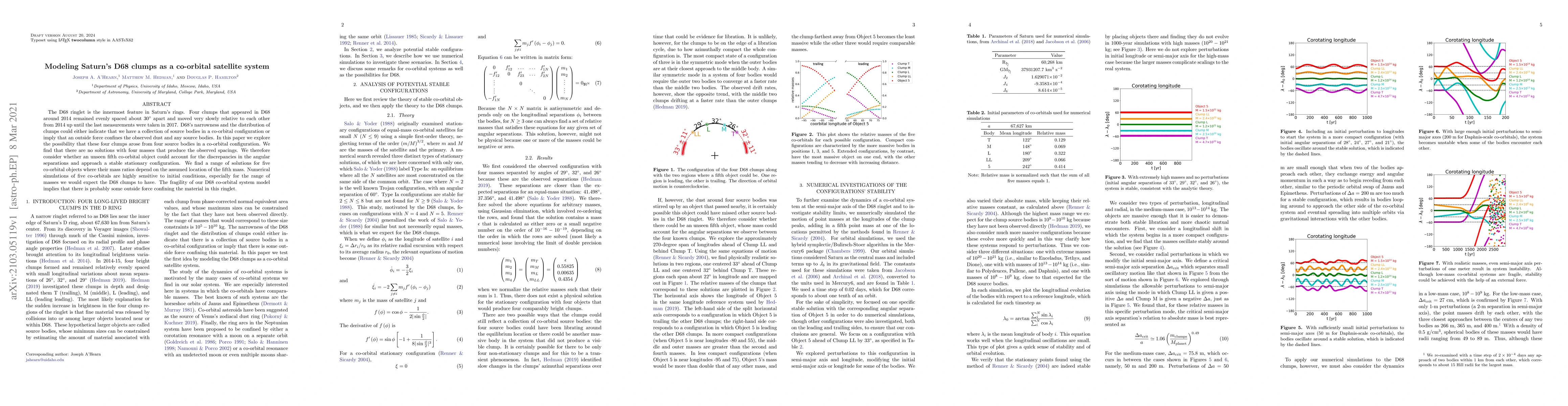 The D68 ringlet is the innermost feature in Saturn's rings. Four clumps that appeared in D68 around 2014 remained evenly spaced about 30 degrees apart and moved very slowly relative to each other from 2014 up until the last measurements were taken in 2017. D68's narrowness and the distribution of clumps could either indicate that we have a collection of source bodies in a co-orbital configuration or imply that an outside force confines the observed dust and any source bodies. In this paper we explore the possibility that these four clumps arose from four source bodies in a co-orbital configuration. We find that there are no solutions with four masses that produce the observed spacings. We therefore consider whether an unseen fifth co-orbital object could account for the discrepancies in the angular separations and approach a stable stationary configuration. We find a range of solutions for five co-orbital objects where their mass ratios depend on the assumed location of the fifth mass. Numerical simulations of five co-orbitals are highly sensitive to initial conditions, especially for the range of masses we would expect the D68 clumps to have. The fragility of our D68 co-orbital system model implies that there is probably some outside force confining the material in this ringlet.