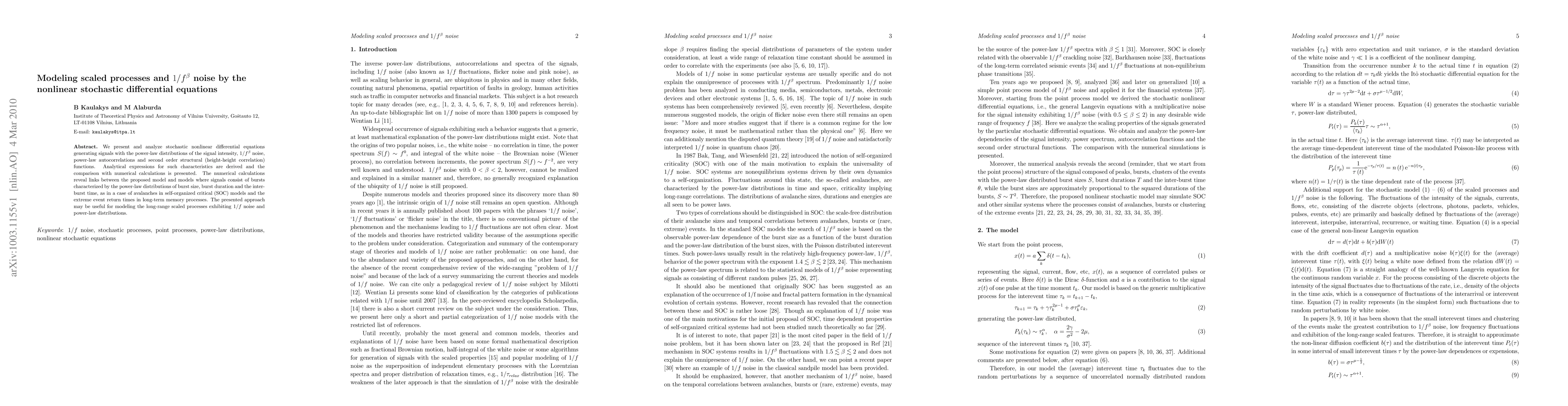 This paper develops and analyzes stochastic nonlinear differential equations that generate signals with 1/f^b noise and power-law distributions. The model's analytical expressions are compared with numerical results, revealing connections to burst-based models like self-organized criticality and long-term memory processes.