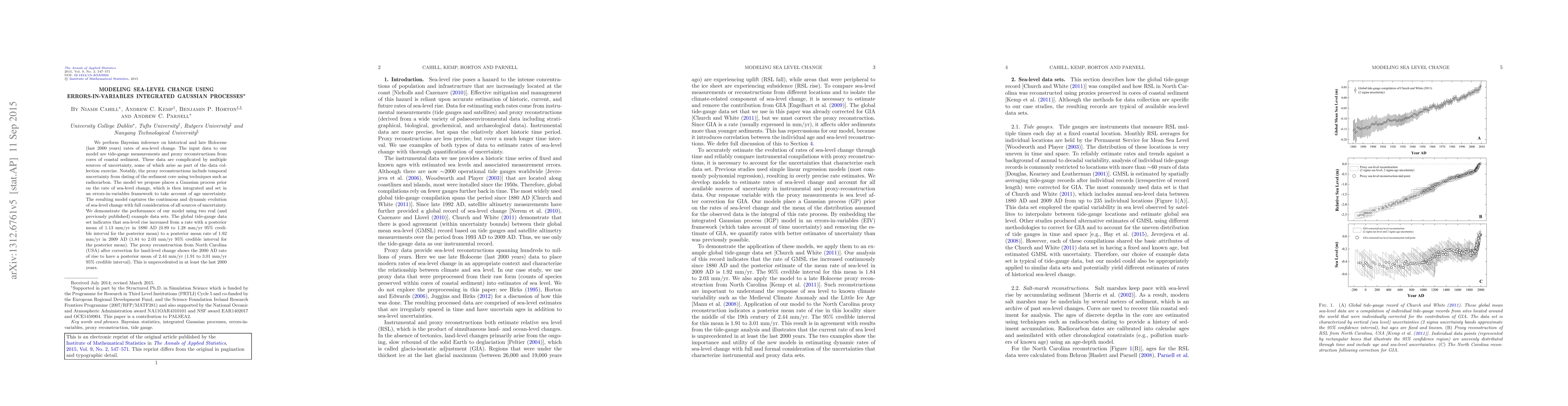 We perform Bayesian inference on historical and late Holocene (last 2000 years) rates of sea-level change. The input data to our model are tide-gauge measurements and proxy reconstructions from cores of coastal sediment. These data are complicated by multiple sources of uncertainty, some of which arise as part of the data collection exercise. Notably, the proxy reconstructions include temporal uncertainty from dating of the sediment core using techniques such as radiocarbon. The model we propose places a Gaussian process prior on the rate of sea-level change, which is then integrated and set in an errors-in-variables framework to take account of age uncertainty. The resulting model captures the continuous and dynamic evolution of sea-level change with full consideration of all sources of uncertainty. We demonstrate the performance of our model using two real (and previously published) example data sets. The global tide-gauge data set indicates that sea-level rise increased from a rate with a posterior mean of 1.13 mm$/$yr in 1880 AD (0.89 to 1.28 mm$/$yr 95% credible interval for the posterior mean) to a posterior mean rate of 1.92 mm$/$yr in 2009 AD (1.84 to 2.03 mm$/$yr 95% credible interval for the posterior mean). The proxy reconstruction from North Carolina (USA) after correction for land-level change shows the 2000 AD rate of rise to have a posterior mean of 2.44 mm$/$yr (1.91 to 3.01 mm$/$yr 95% credible interval). This is unprecedented in at least the last 2000 years.