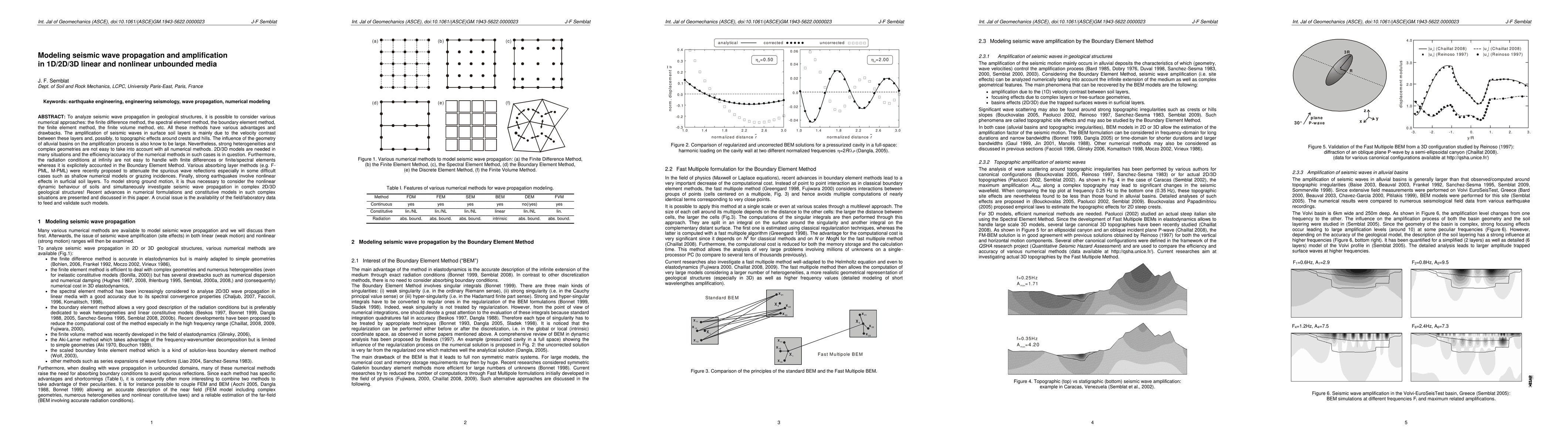 This paper explores various numerical methods for modeling seismic wave propagation and amplification in linear and nonlinear geological structures, highlighting the challenges of handling complex geometries and heterogeneities. It discusses recent advances in numerical formulations and constitutive models to address nonlinear dynamic behavior in soils and the importance of field/laboratory data for model validation.