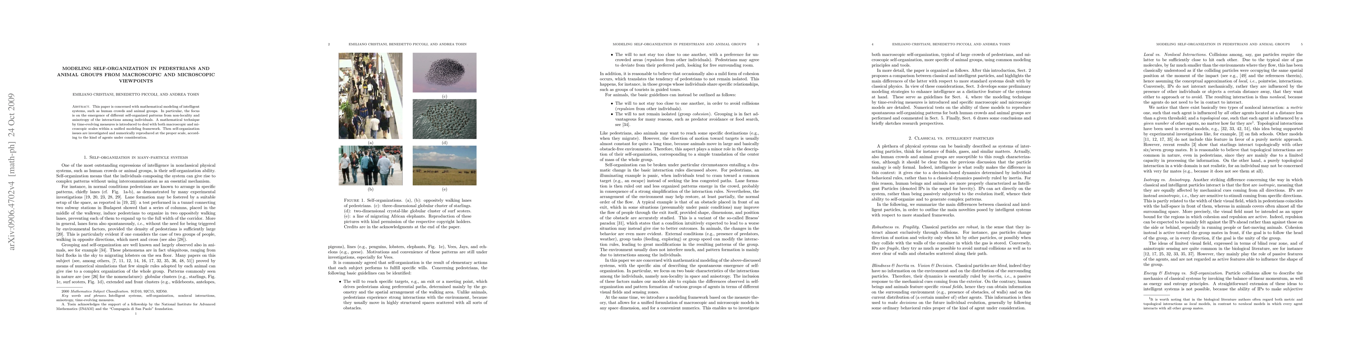 This paper is concerned with mathematical modeling of intelligent systems, such as human crowds and animal groups. In particular, the focus is on the emergence of different self-organized patterns from non-locality and anisotropy of the interactions among individuals. A mathematical technique by time-evolving measures is introduced to deal with both macroscopic and microscopic scales within a unified modeling framework. Then self-organization issues are investigated and numerically reproduced at the proper scale, according to the kind of agents under consideration.