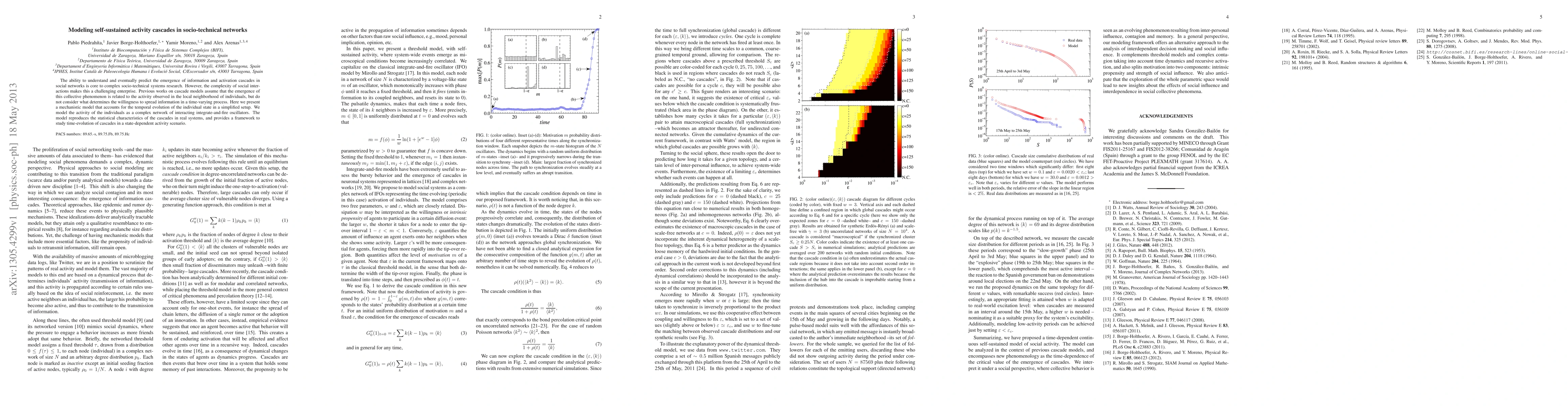 The ability to understand and eventually predict the emergence of information and activation cascades in social networks is core to complex socio-technical systems research. However, the complexity of social interactions makes this a challenging enterprise. Previous works on cascade models assume that the emergence of this collective phenomenon is related to the activity observed in the local neighborhood of individuals, but do not consider what determines the willingness to spread information in a time-varying process. Here we present a mechanistic model that accounts for the temporal evolution of the individual state in a simplified setup. We model the activity of the individuals as a complex network of interacting integrate-and-fire oscillators. The model reproduces the statistical characteristics of the cascades in real systems, and provides a framework to study time-evolution of cascades in a state-dependent activity scenario.