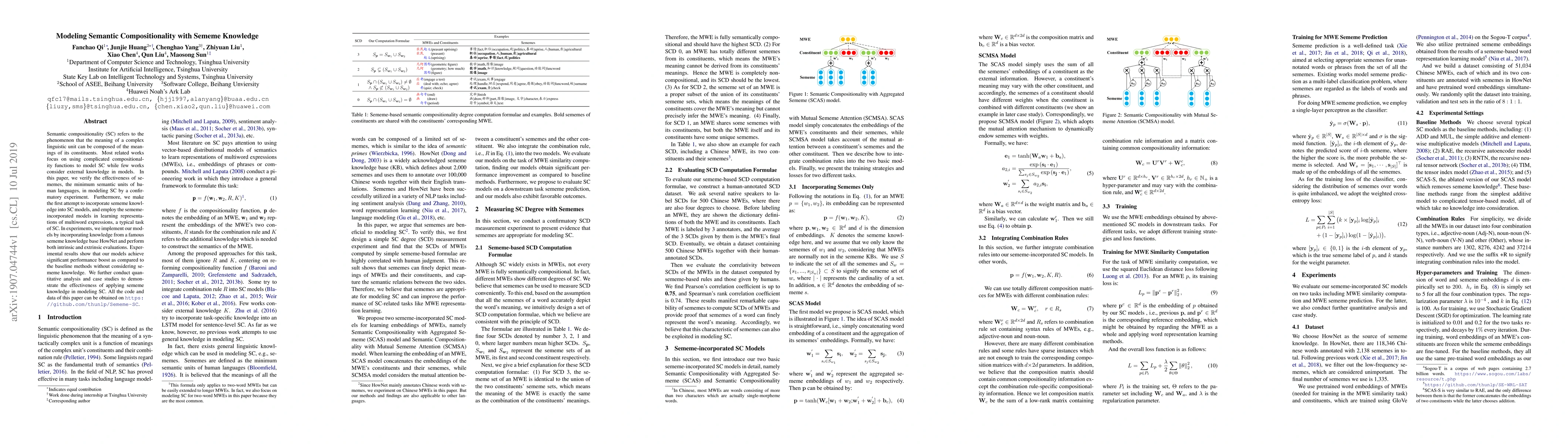 This paper explores the use of sememes, the smallest semantic units in human language, to model semantic compositionality, demonstrating significant performance improvements over baseline methods when incorporating sememe knowledge from HowNet. Experiments show enhanced representation learning for multiword expressions.