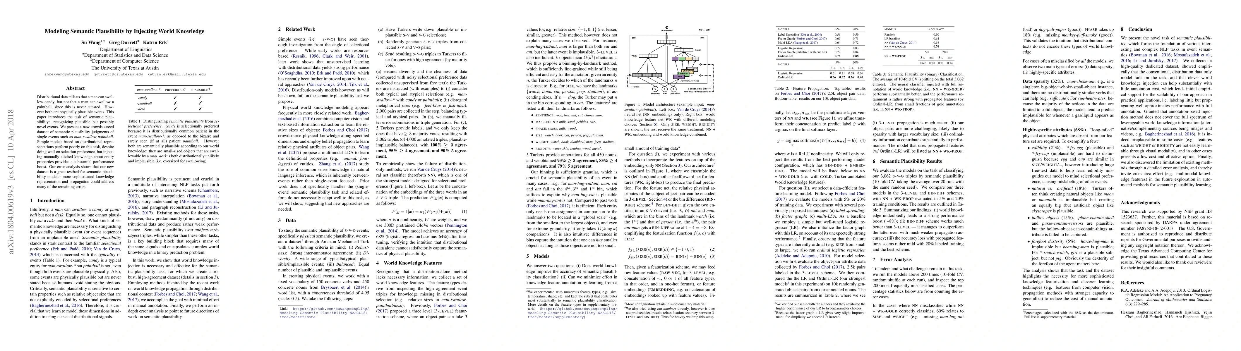 This paper introduces the task of semantic plausibility, focusing on recognizing plausible but novel events, and presents a new dataset for evaluating such models. It finds that incorporating manually elicited world knowledge significantly improves model performance over simple distributional representations.