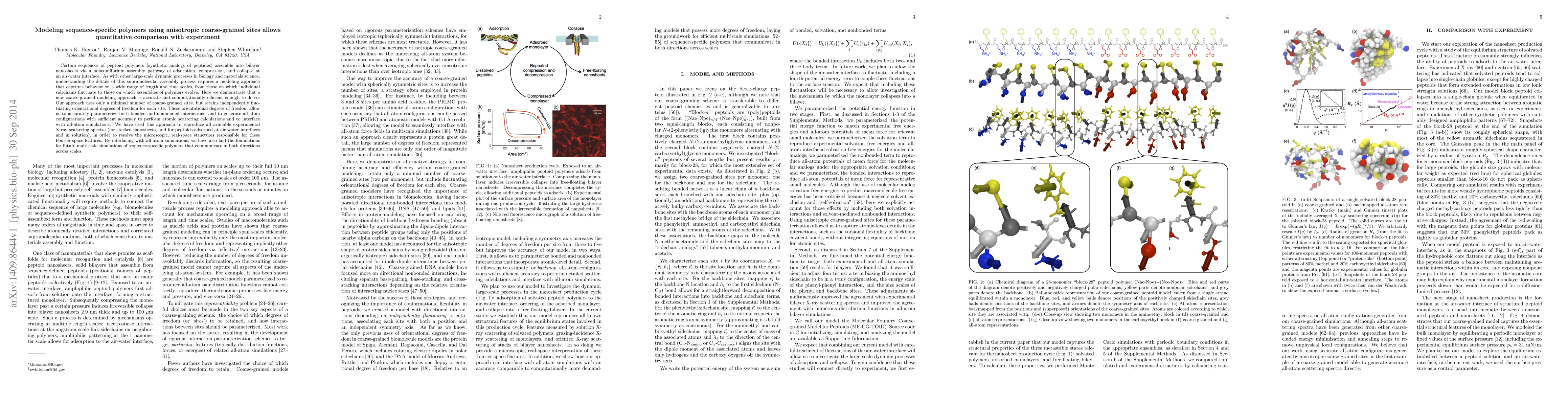 Certain sequences of peptoid polymers (synthetic analogs of peptides) assemble into bilayer nanosheets via a nonequilibrium assembly pathway of adsorption, compression, and collapse at an air-water interface. As with other large-scale dynamic processes in biology and materials science, understanding the details of this supramolecular assembly process requires a modeling approach that captures behavior on a wide range of length and time scales, from those on which individual sidechains fluctuate to those on which assemblies of polymers evolve. Here we demonstrate that a new coarse-grained modeling approach is accurate and computationally efficient enough to do so. Our approach uses only a minimal number of coarse-grained sites, but retains independently fluctuating orientational degrees of freedom for each site. These orientational degrees of freedom allow us to accurately parameterize both bonded and nonbonded interactions, and to generate all-atom configurations with sufficient accuracy to perform atomic scattering calculations and to interface with all-atom simulations. We have used this approach to reproduce all available experimental X-ray scattering spectra (for stacked nanosheets, and for peptoids adsorbed at air-water interfaces and in solution), in order to resolve the microscopic, real-space structures responsible for these Fourier-space features. By interfacing with all-atom simulations, we have also laid the foundations for future multiscale simulations of sequence-specific polymers that communicate in both directions across scales.
