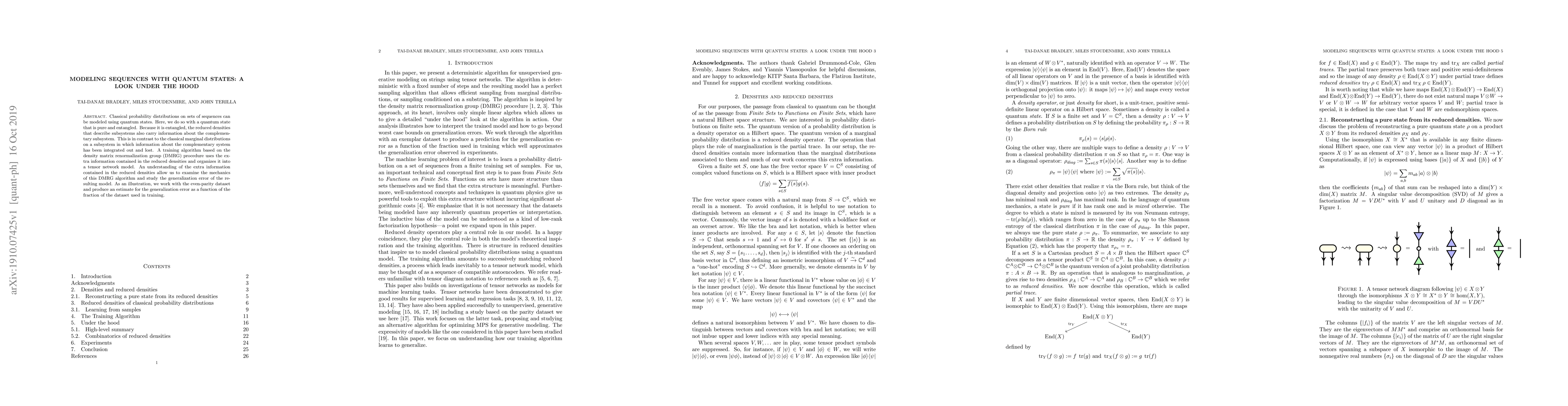 Classical probability distributions on sets of sequences can be modeled using quantum states. Here, we do so with a quantum state that is pure and entangled. Because it is entangled, the reduced densities that describe subsystems also carry information about the complementary subsystem. This is in contrast to the classical marginal distributions on a subsystem in which information about the complementary system has been integrated out and lost. A training algorithm based on the density matrix renormalization group (DMRG) procedure uses the extra information contained in the reduced densities and organizes it into a tensor network model. An understanding of the extra information contained in the reduced densities allow us to examine the mechanics of this DMRG algorithm and study the generalization error of the resulting model. As an illustration, we work with the even-parity dataset and produce an estimate for the generalization error as a function of the fraction of the dataset used in training.