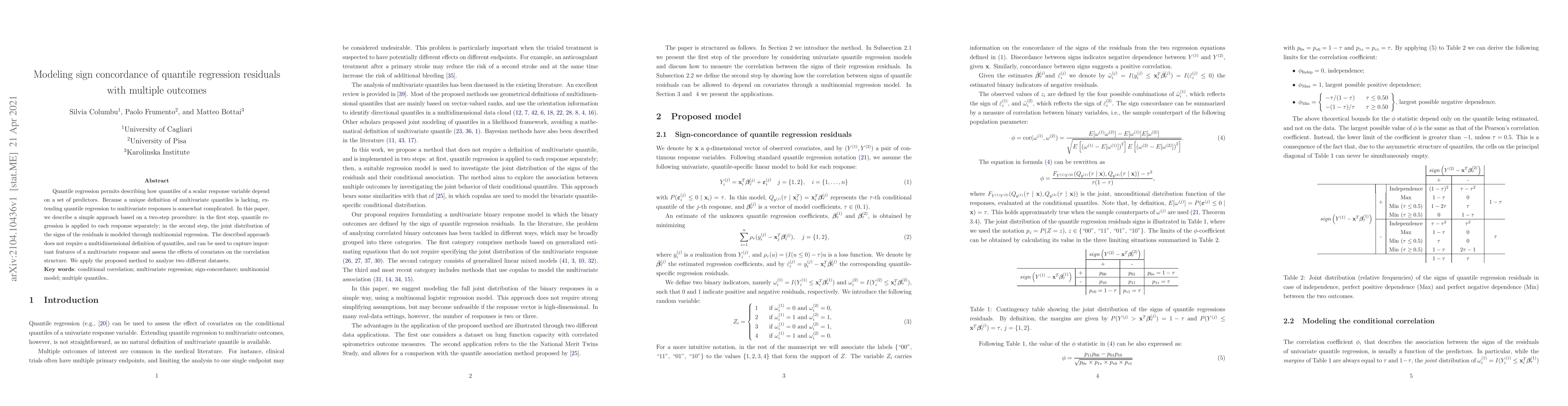 This paper proposes a two-step method for modeling quantile regression with multiple outcomes, applying quantile regression separately to each outcome and then modeling the joint distribution of residual signs via multinomial regression. This approach avoids the need for a multidimensional quantile definition and assesses covariate effects on correlation structures.