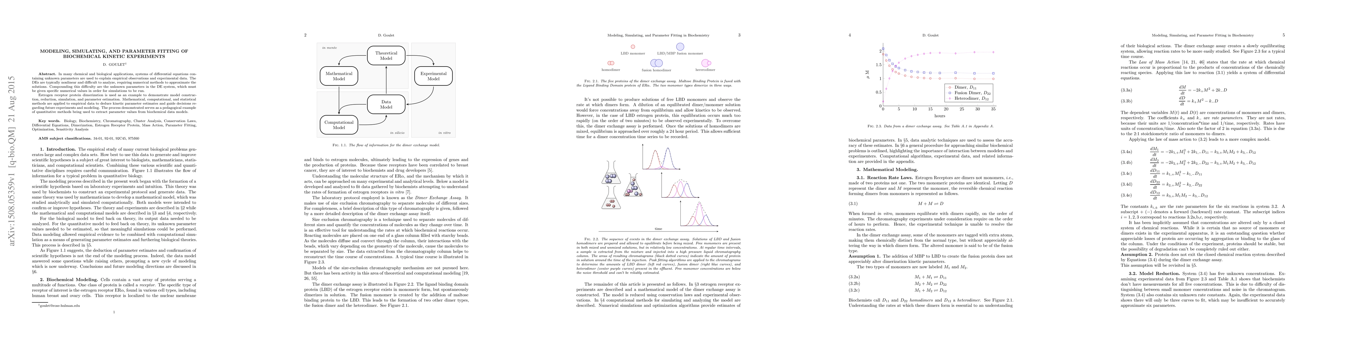 In many chemical and biological applications, systems of differential equations containing unknown parameters are used to explain empirical observations and experimental data. The DEs are typically nonlinear and difficult to analyze, requiring numerical methods to approximate the solutions. Compounding this difficulty are the unknown parameters in the DE system, which must be given specific numerical values in order for simulations to be run. Estrogen receptor protein dimerization is used as an example to demonstrate model construction, reduction, simulation, and parameter estimation. Mathematical, computational, and statistical methods are applied to empirical data to deduce kinetic parameter estimates and guide decisions regarding future experiments and modeling. The process demonstrated serves as a pedagogical example of quantitative methods being used to extract parameter values from biochemical data models.