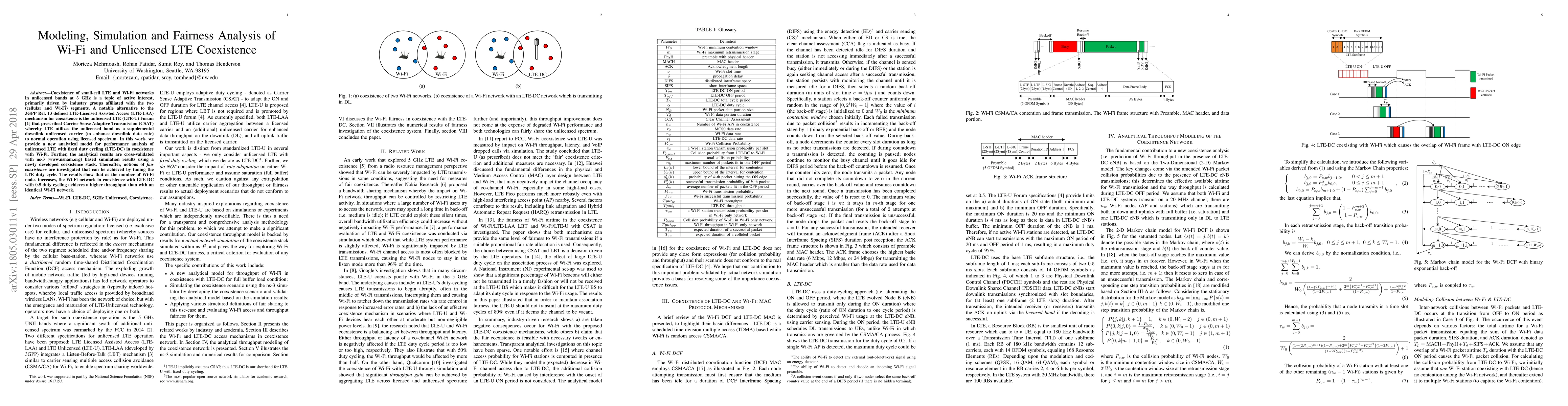 This paper presents an analytical model and simulation for analyzing the coexistence of unlicensed LTE (LTE-DC) and Wi-Fi networks at 5 GHz, showing that LTE-DC with 0.5 duty cycling can achieve fairer coexistence and higher Wi-Fi throughput compared to LTE-LAA. Simulation results validate the analytical model using a newly developed coexistence stack in ns-3.